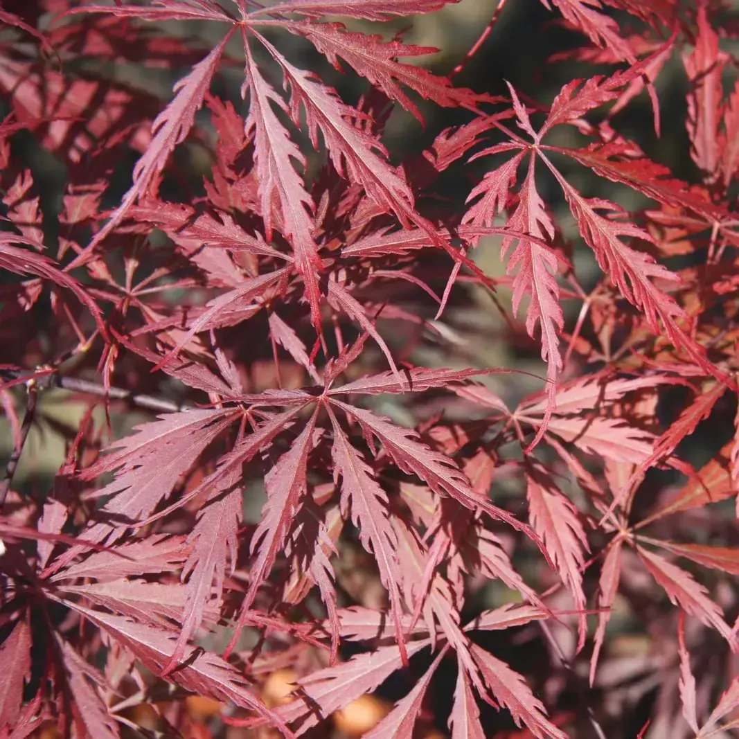 Acer 'Tamukeyama' is a striking Japanese Maple with finely dissected, lace-like foliage in rich shades of red and purple. Its elegant, cascading habit creates a graceful, architectural presence, making it a standout feature in any garden.