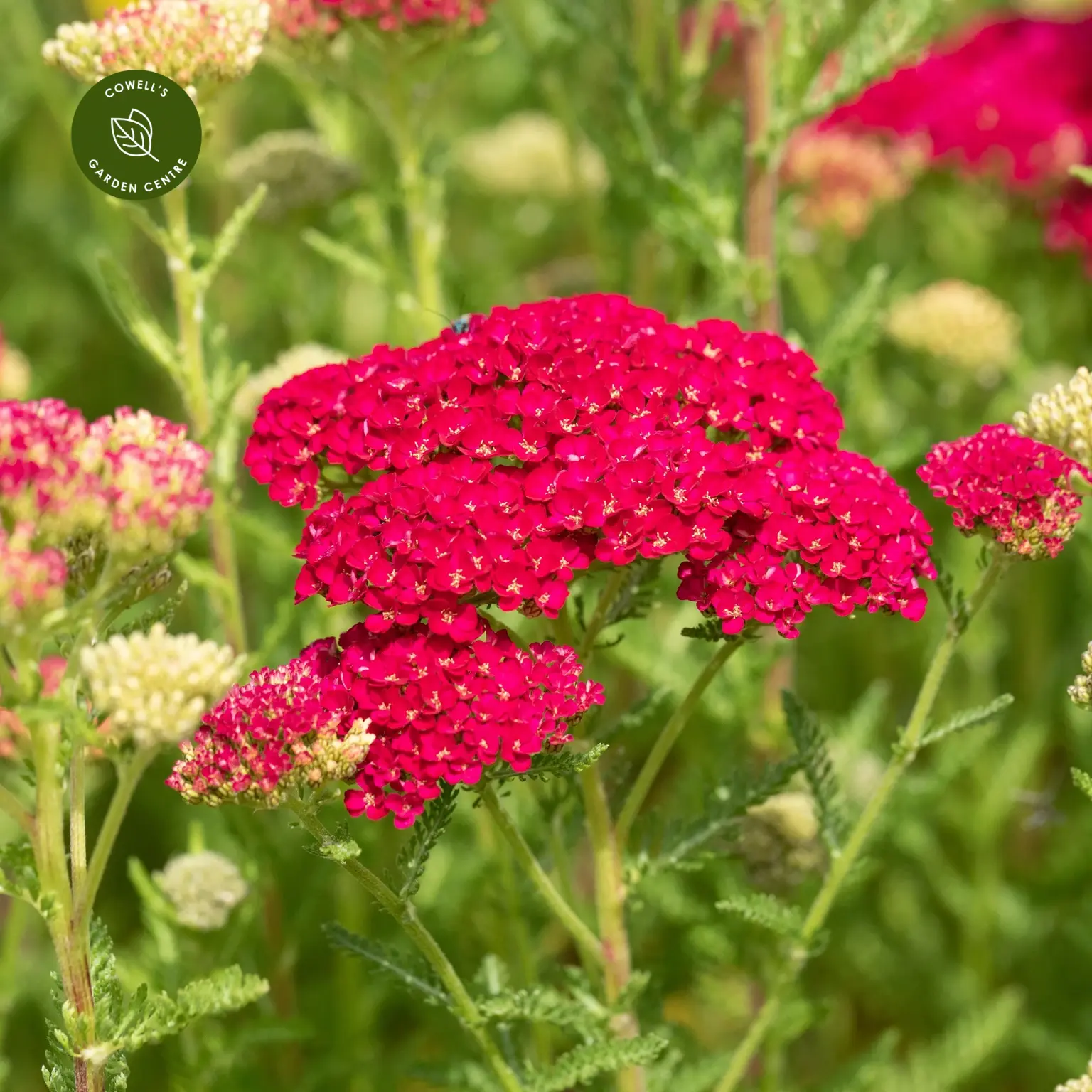 Achillea millefolium 'Tutti Frutti Pomegranate' is a vibrant, compact perennial producing flat clusters of rich pomegranate-red flowers from early summer into autumn. Its finely cut, aromatic green foliage forms a neat mound, adding texture and colour to borders and naturalistic planting.