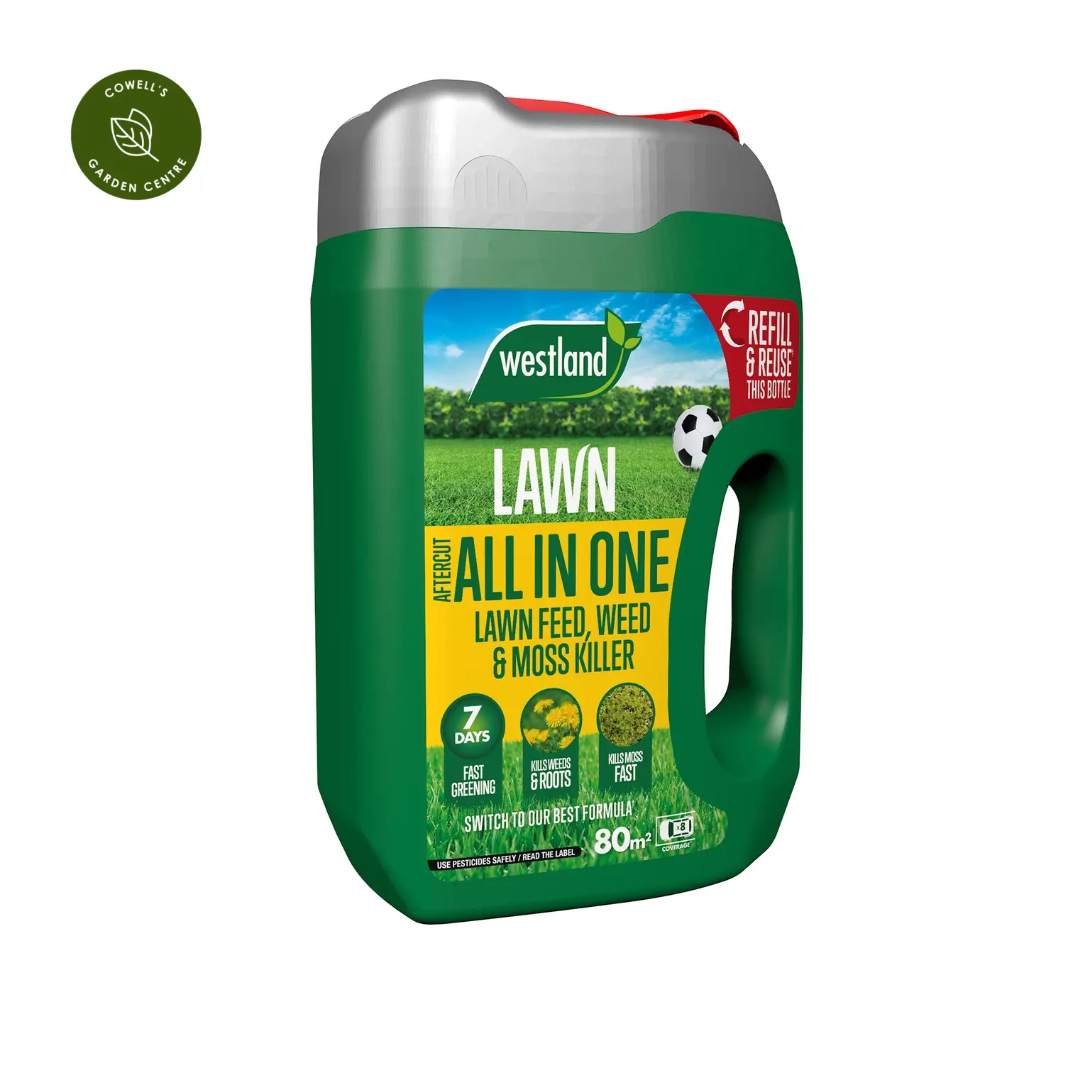 Our lawns are often the main feature of our garden. They are a place where our children and pets play and families gather for BBQs, however, this can lead to a worn down, tired looking lawn. Aftercut All In One Lawn Feed, Weed & Moss Killer is a comprehensive solution for your lawn care needs. This triple action lawn treatment not only greens and feeds your lawn but also effectively eliminates weeds and moss.