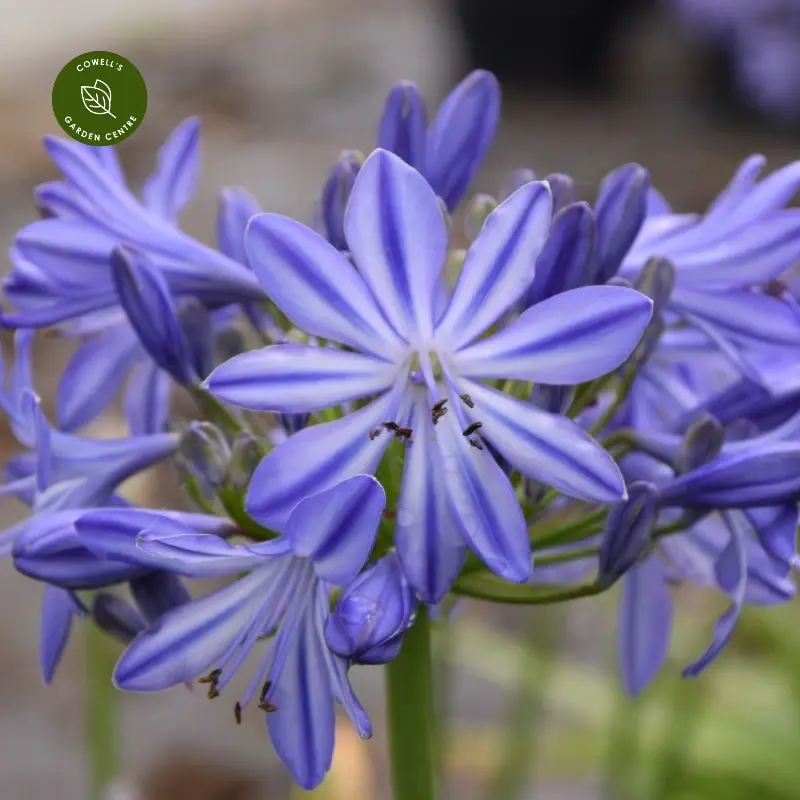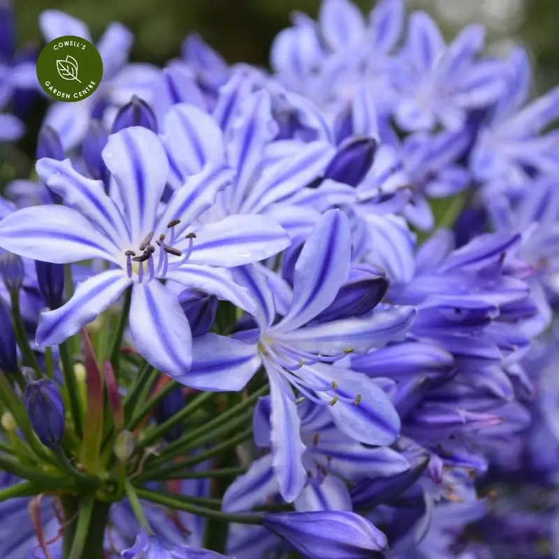 Agapanthus 'Marijke' is a superb evergreen African Lily, admired for its abundant display of rich violet-blue flowers, each petal marked with a distinctive deeper stripe that adds extra depth and detail. The blooms are held on short, sturdy stems above neat clumps of foliage, creating a balanced and eye-catching display.
