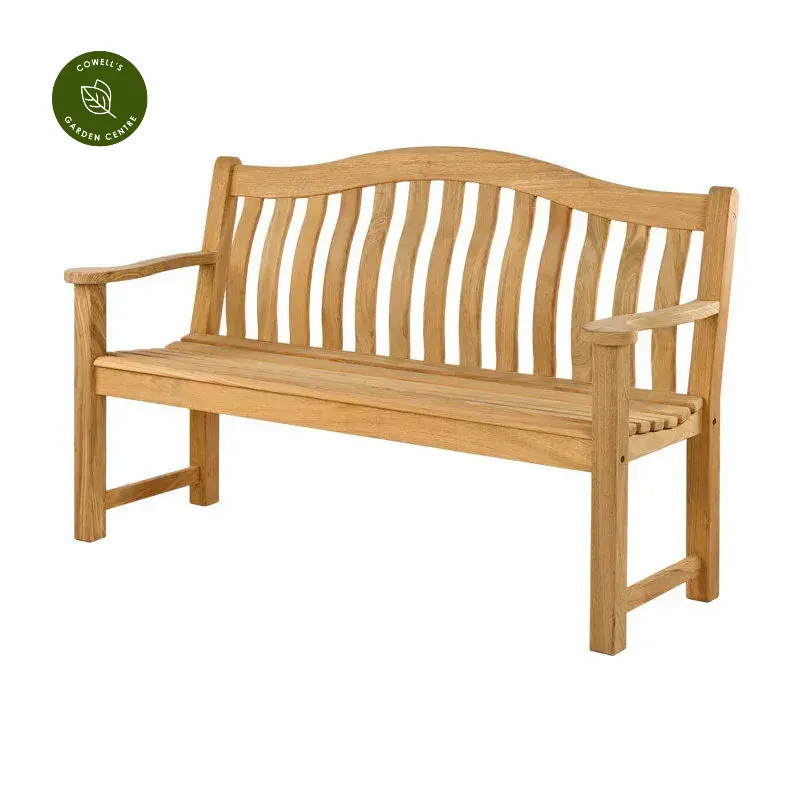 This bench is ideal for a patio or decking area. It has a beautifully smooth finish, with a closely interlocked grain in the wood. The slatted back, the rounded arms, the curved arch at the back – they all tick that quintessentially English brief. If left untreated, the wood will will mellow to a classic silver-grey appearance.