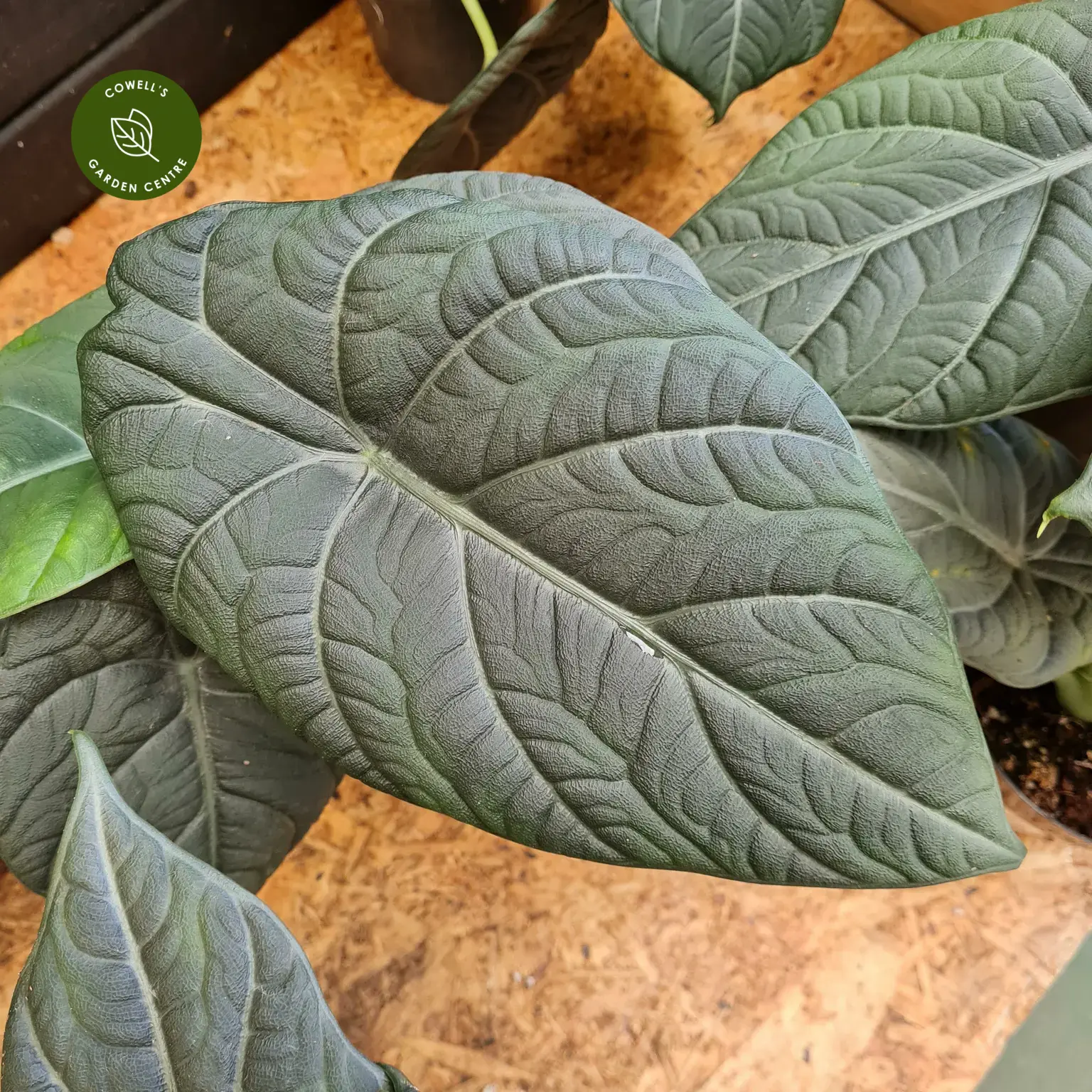 Alocasia maharani 'Grey Dragon' is a rare jewel alocasia with thick, leathery leaves in a unique grey-green tone, marked by pronounced veining that gives them a dragon-scale appearance. Compact and sculptural, it makes a striking statement in any indoor plant collection.
