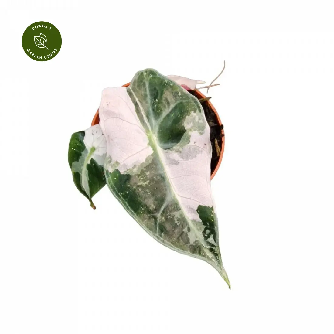 Alocasia 'Polly Variegata' is a rare and compact variegated form of the classic African Mask plant, prized for its dramatic shield-shaped leaves with bold veining and distinctive wavy edges. In this exceptional variegated form, the deep green foliage is marbled with unpredictable splashes of cream, white, and occasional soft pink, giving each leaf a unique, collector-quality appearance.
