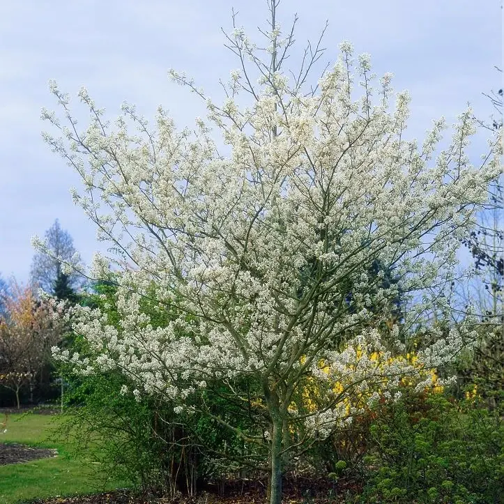 Amelanchier × grandiflora 'Ballerina' is a graceful deciduous shrub or small tree, valued for its year-round appeal and reliable performance in UK gardens. In spring it produces masses of star-shaped white blossom, followed by summer berries and vibrant autumn foliage, making it a standout choice for borders, woodland edges and specimen planting.