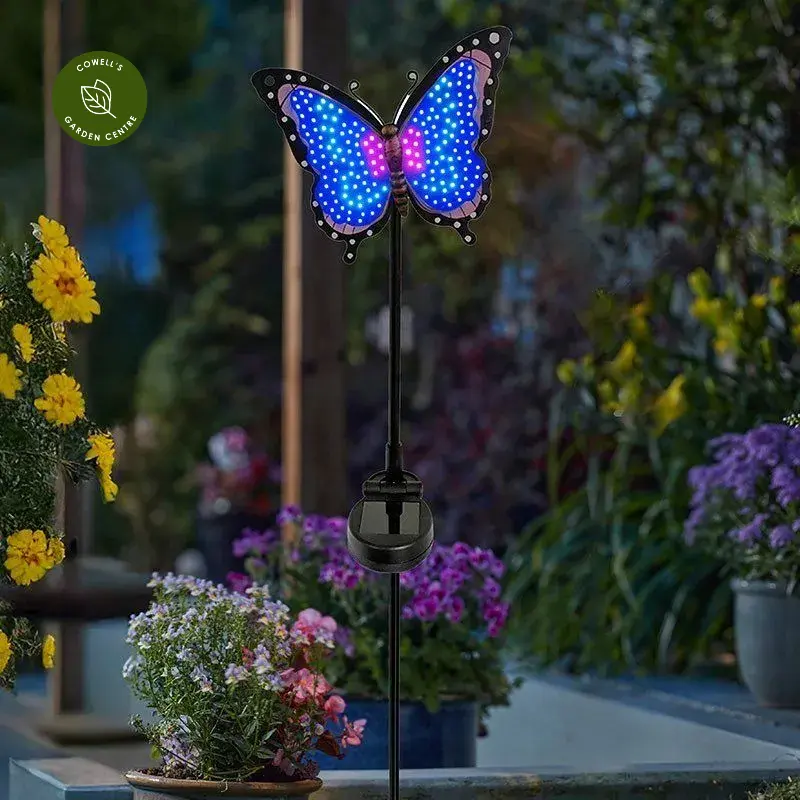 Add a playful touch of colour to borders and beds with this eye-catching butterfly solar stake light. Flashing multi-coloured LEDs create a lively effect, perfect for brightening up paths, pots and outdoor spaces. Charging by day and lighting up automatically at night, it’s a simple, cable-free way to bring movement and interest to the garden.