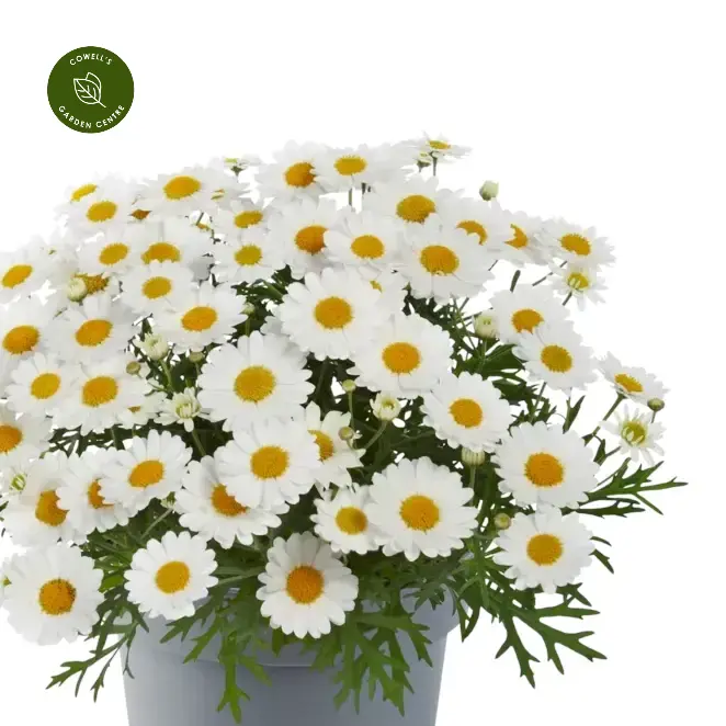 Argyranthemum frutescens is a cheerful, free-flowering shrub producing masses of daisy-like blooms. Its finely divided, soft green foliage creates a light, airy backdrop for the abundant flowers. The Santorini series is a compact and early flowering range, smaller than the Madeira series.