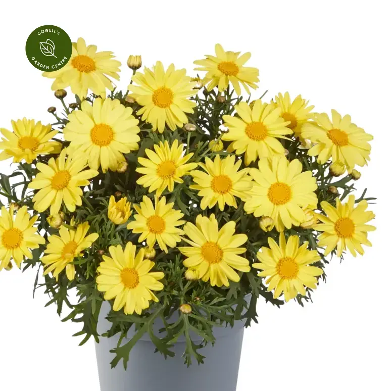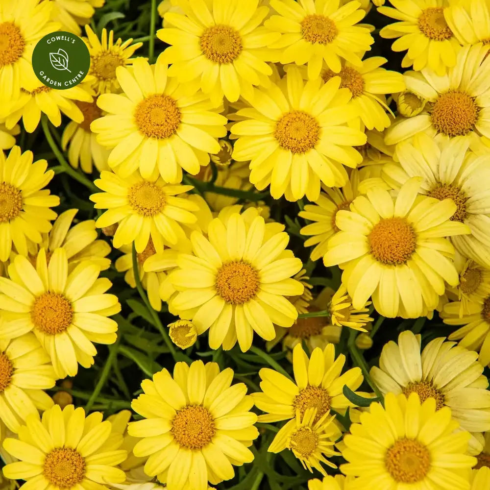 Argyranthemum frutescens is a cheerful, free-flowering shrub producing masses of daisy-like blooms. Its finely divided, soft green foliage creates a light, airy backdrop for the abundant flowers. The Santorini series is a compact and early flowering range, smaller than the Madeira series.