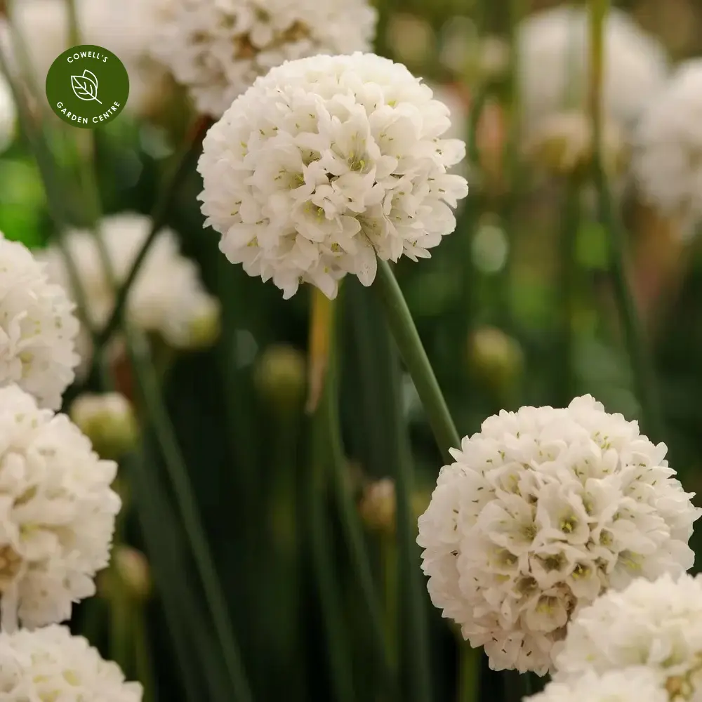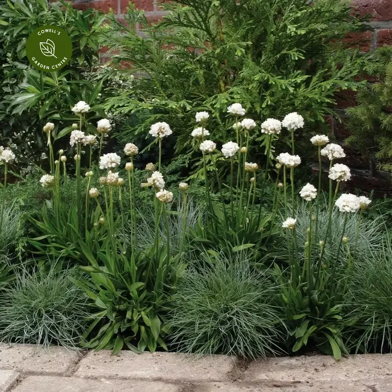 Armeria pseudarmeria 'Ballerina White' is a compact, long-flowering perennial producing neat clusters of pure white, globe-shaped flowers held above tidy tufts of grassy evergreen foliage. Flowering freely from late spring into summer, it creates a bright and elegant display.