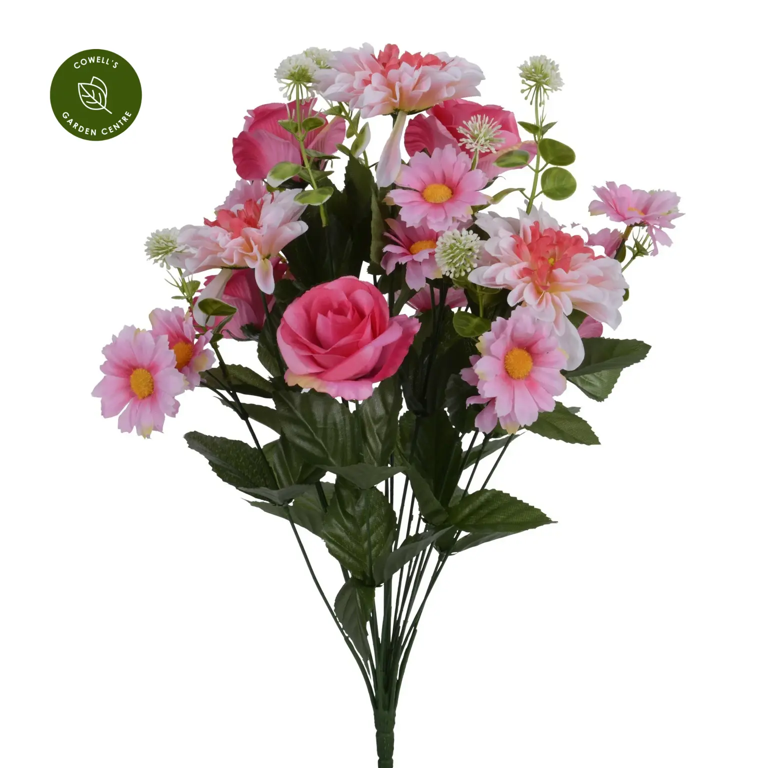 Elegant artificial mixed pink bouquet featuring Roses, Chrysanthemums and Daisies, beautifully arranged to bring soft colour and charm indoors.