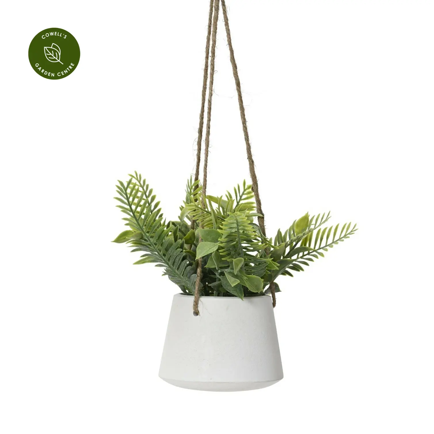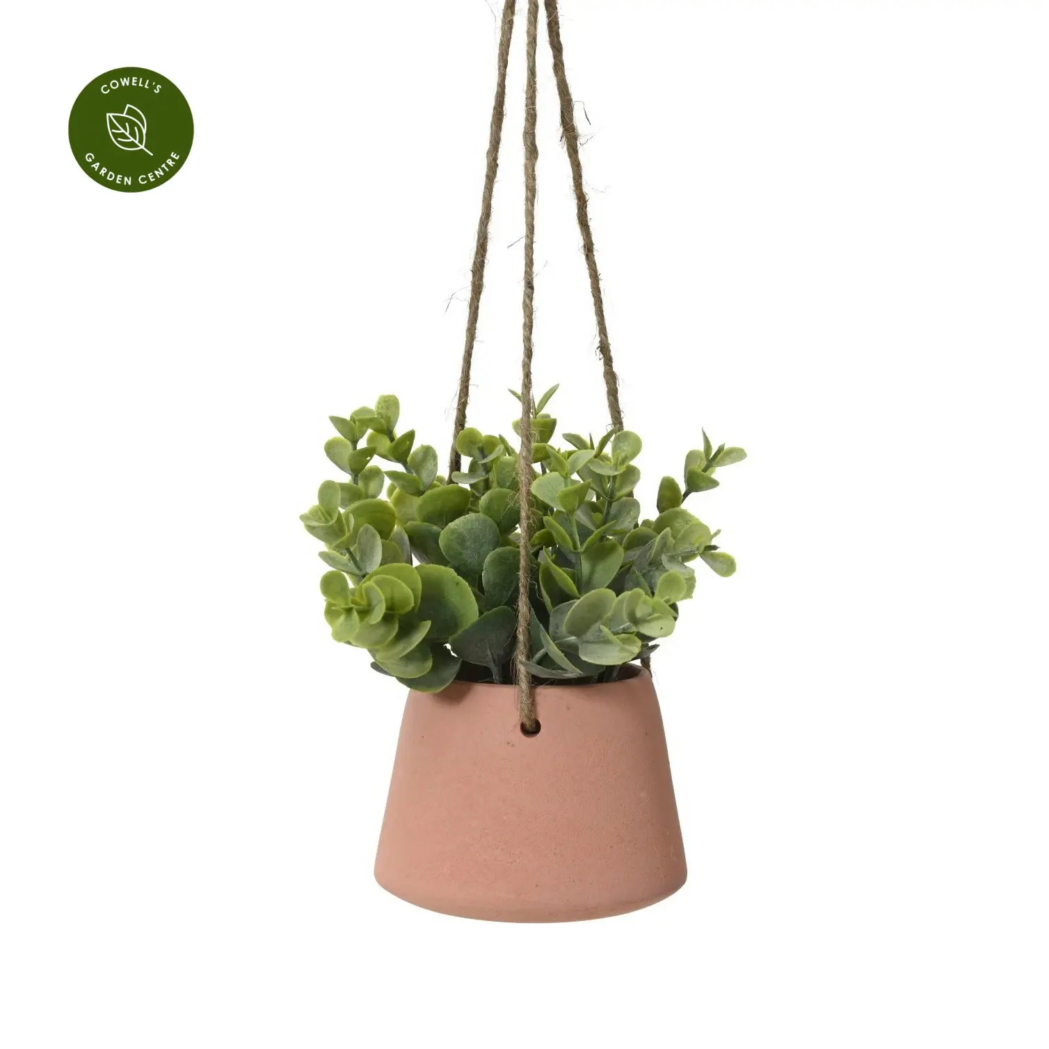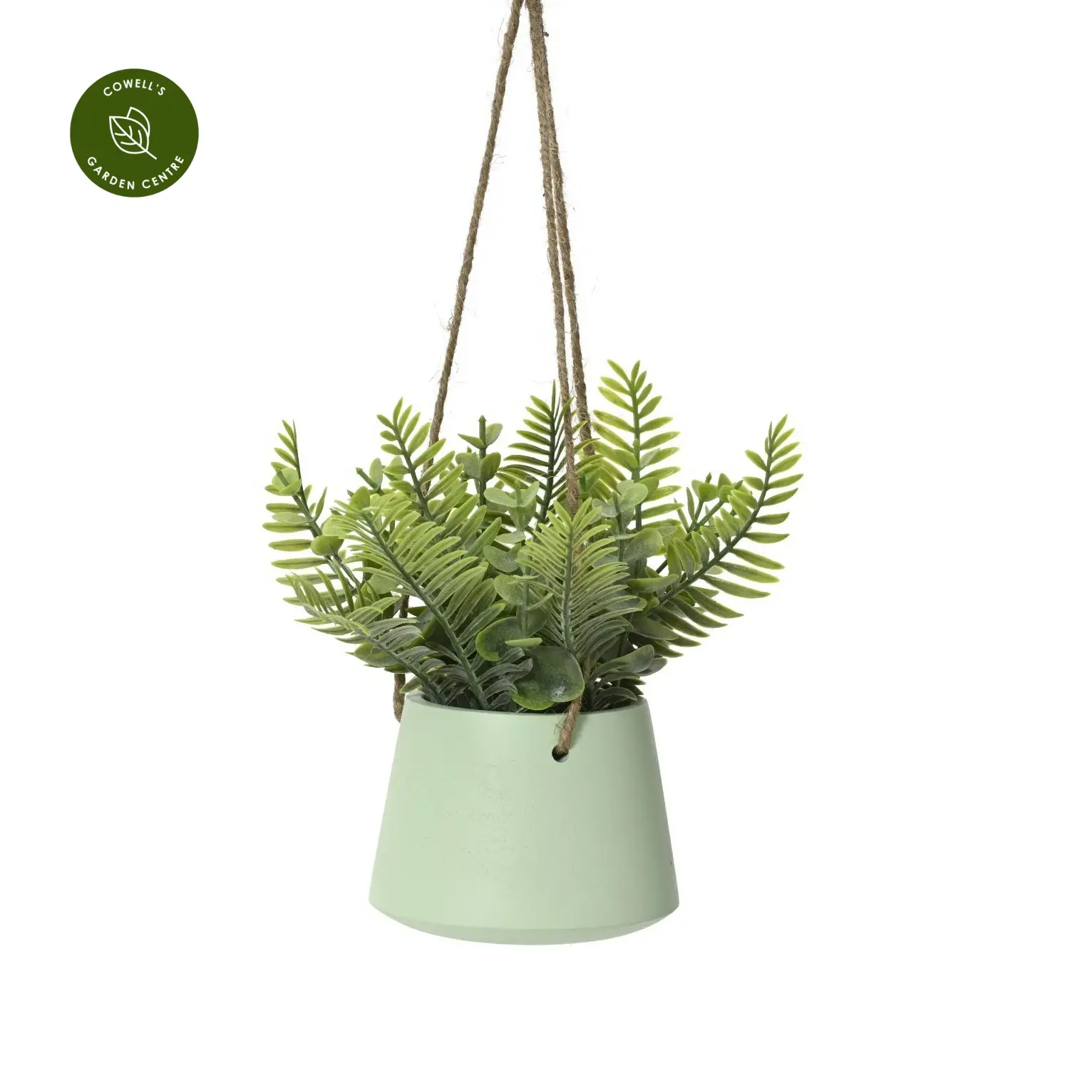 Realistic artificial green plant presented in a colourful hanging pot, ideal for compact indoor styling.