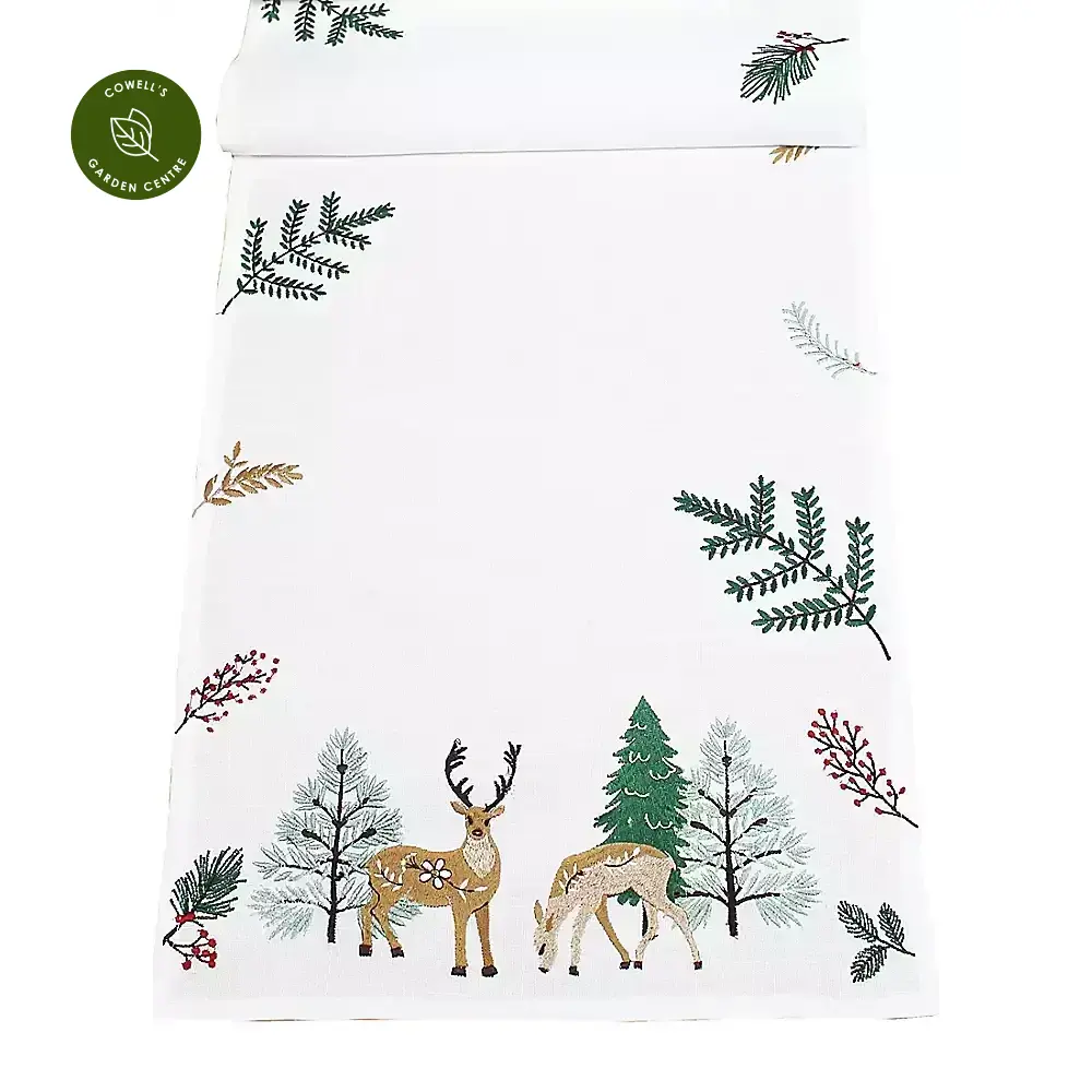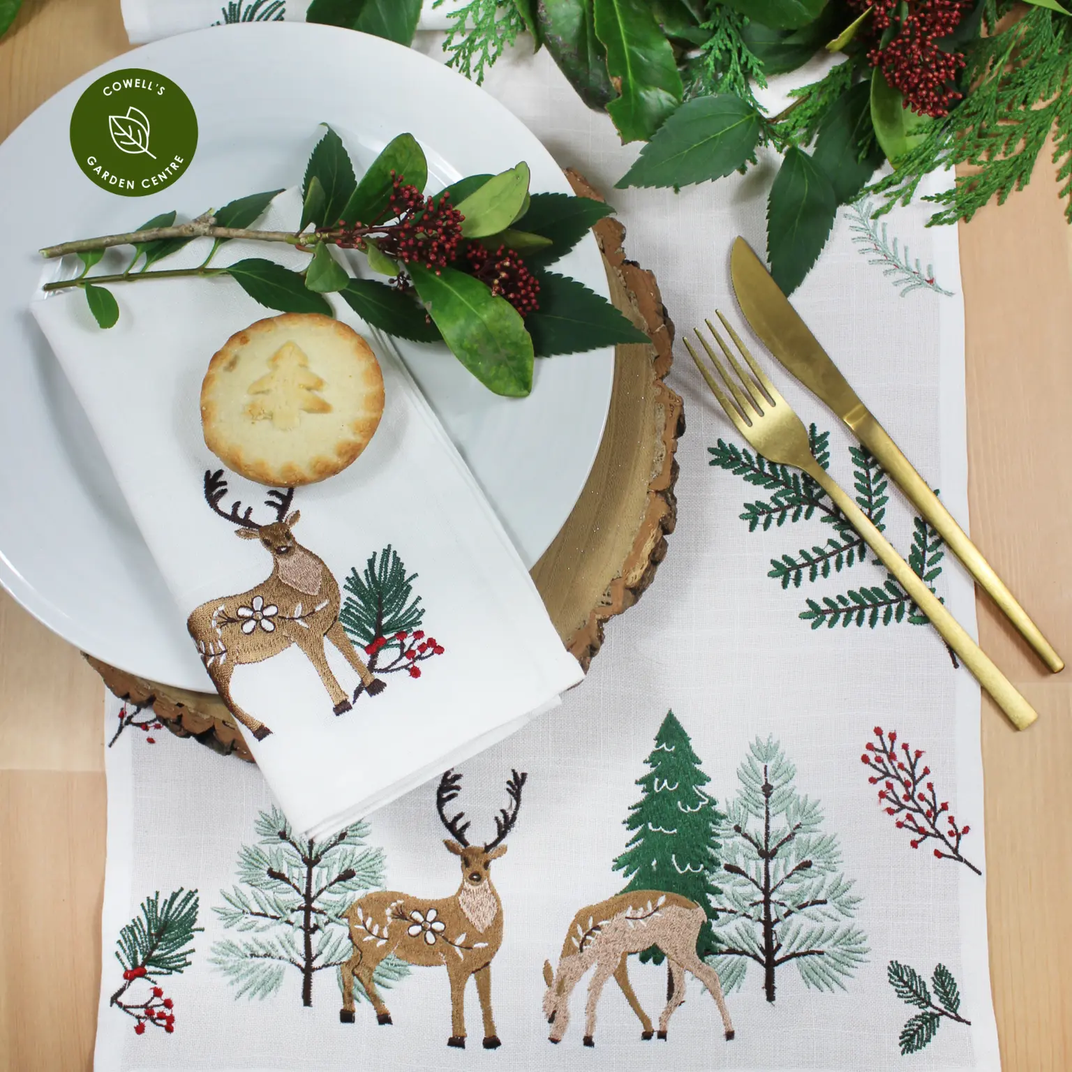 Bring the winter woodland indoors with the Arwell collection, featuring an embroidered design of serene deer in a calming forest, with white backdrop. This rustic table runner is perfect for creating a classic seasonal atmosphere at the dining table.