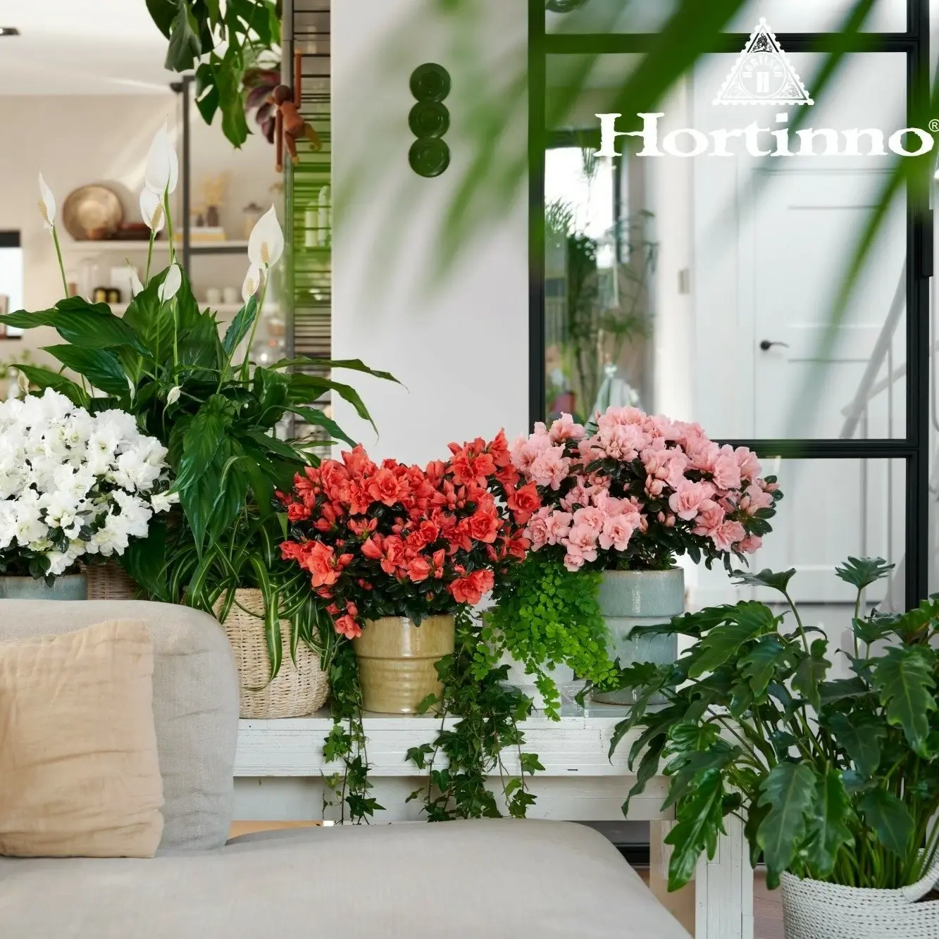 Azalea Hortinno ‘Classic Bicolour’ is a beautiful indoor flowering plant producing masses of elegant bi-coloured blooms, typically blending crisp white with vibrant pink tones. The abundant flowers sit above glossy dark green foliage, creating a bright and eye-catching display that brings instant seasonal colour to the home.