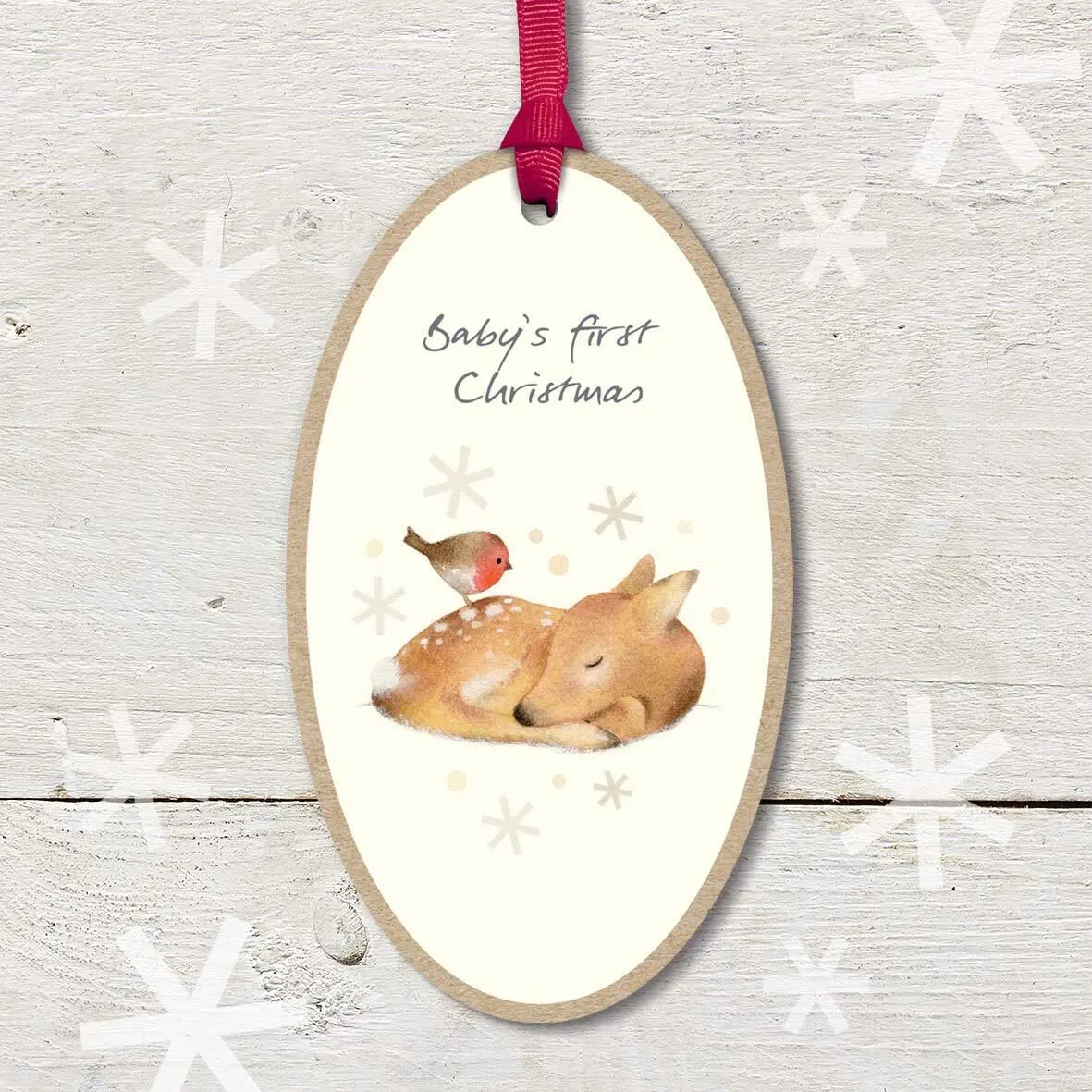 Christmas Wooden Plaque with attached red ribbon, featuring a cute baby fawn and robin friend, with a ’Baby’s First Christmas’ caption. Perfect as a gift or to decorate the home.