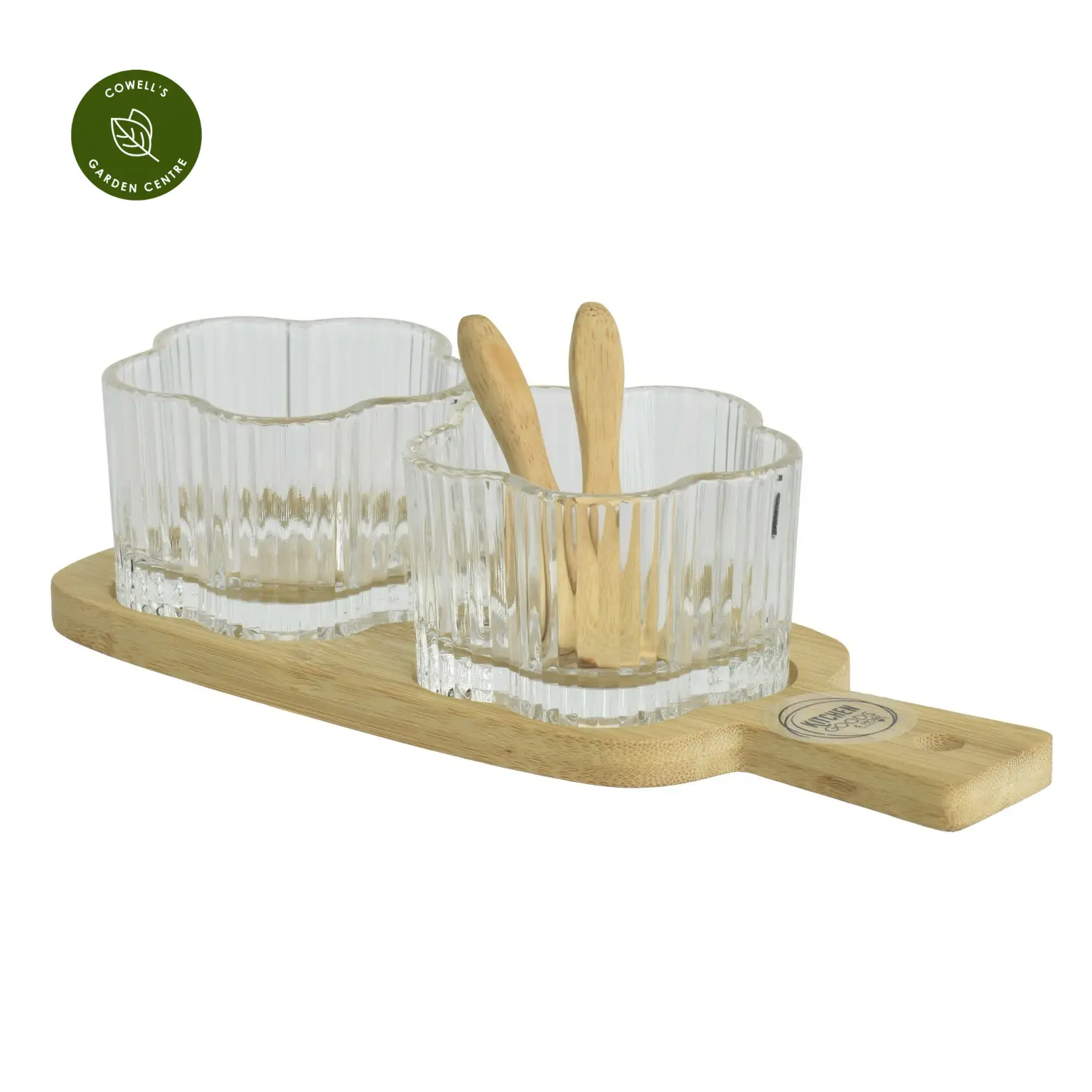 A stylish and practical food safe serving set combining a natural bamboo serving board, with decorative flower-shaped glass dishes and two bamboo spoons - perfect for presenting dips, snacks, or condiments. Practical and durable, it’s ideal for entertaining and relaxed dining.