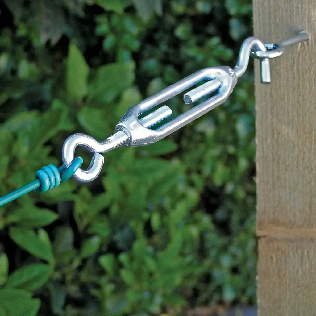 Barrel Strainers feature two sturdy metal hooks for secure attachment and a galvanised weather-resistant finish. Purposefully designed for tensioning line wire; the Hook and Eye are easy to adjust, simply screw in or out one end of the Barrel Strainer to tighten or loosen the tension of the wire.