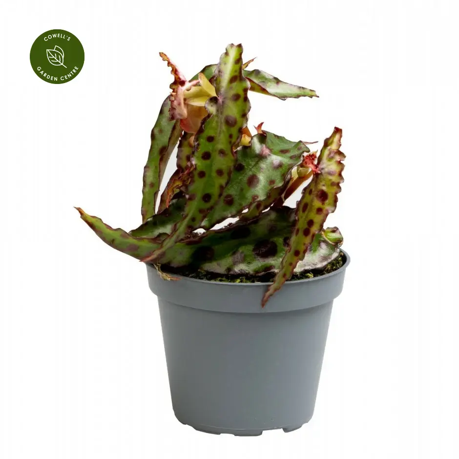 Begonia amphioxus is a rare and eye-catching species prized for its unique lance-shaped leaves, patterned with deep red spots on a pale green background. Its delicate appearance belies a resilient nature, making it a favourite among Begonia collectors and plant enthusiasts seeking something truly distinctive.