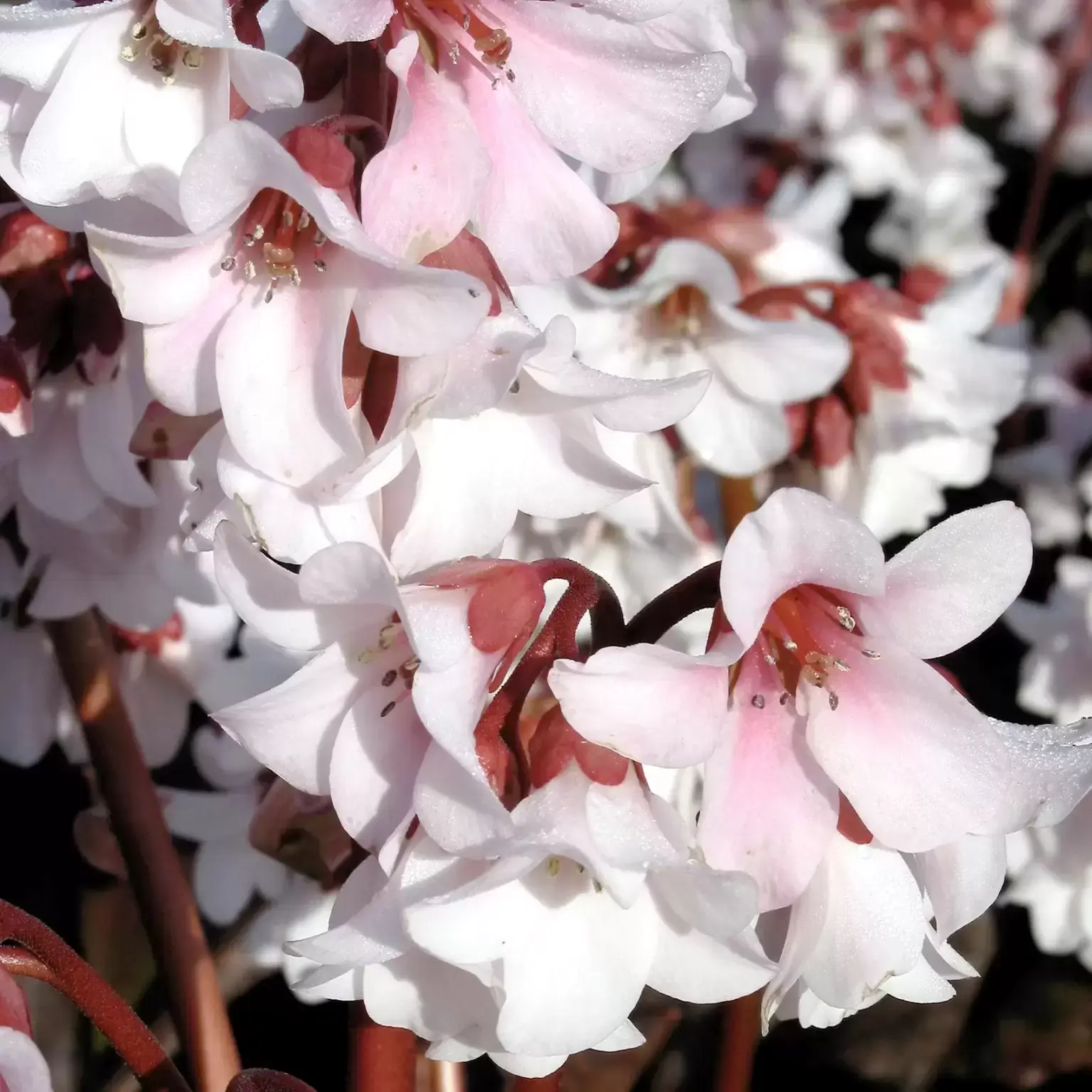 Bergenia 'Apple Blossom' is a reliable, evergreen perennial that brings welcome early colour to the garden. In late winter to early spring, clusters of soft pink flowers rise above bold clumps of deep green, leathery foliage, creating a cheerful display when little else is in bloom.