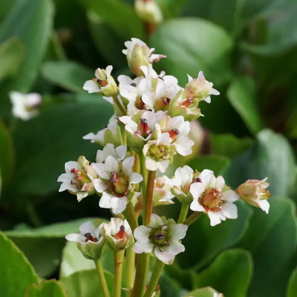 Bergenia 'Bressingham White' is a robust, evergreen perennial forming neat clumps of bold, glossy green leaves. In early spring, upright stems carry clusters of pure white flowers that stand out beautifully against the foliage.
