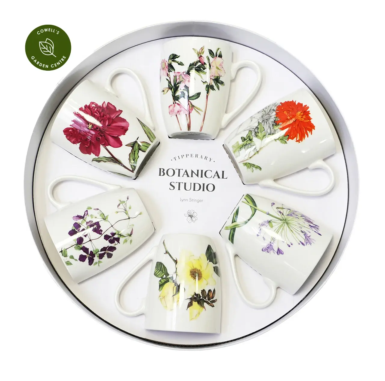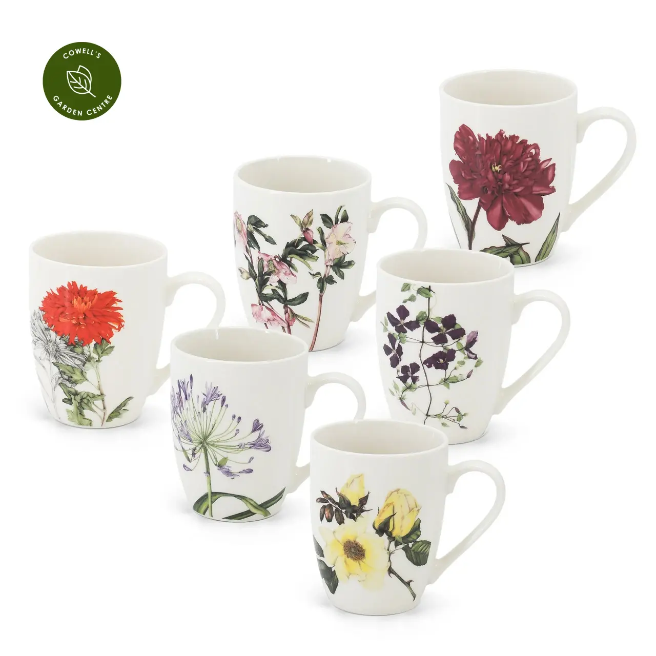 Classic mug set featuring beautiful botanical illustrations, made from bone china with curved handle, and presented in a stylish gift box.