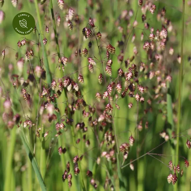 Briza media 'Tinkerbell' is a compact ornamental grass admired for its delicate, heart-shaped flowerheads that sway gracefully in the lightest breeze. From early summer, airy panicles emerge in fresh green before gradually maturing to warm bronze and purple tones, bringing movement, texture, and colour variation to borders, gravel gardens, and prairie-style plantings. Its fine green foliage forms a tidy clump, adding structure even when the flowers have faded.