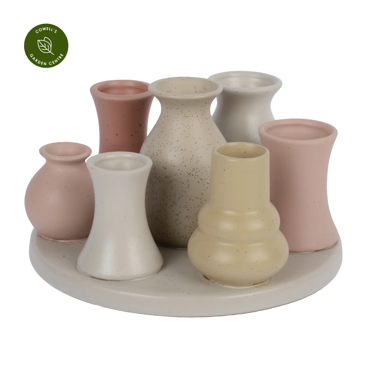 A beautifully coordinated set of miniature bud vases presented on a matching tray, perfect for creating a soft, styled display. The mix of shapes and gentle tones adds interest while keeping a calm, cohesive look.