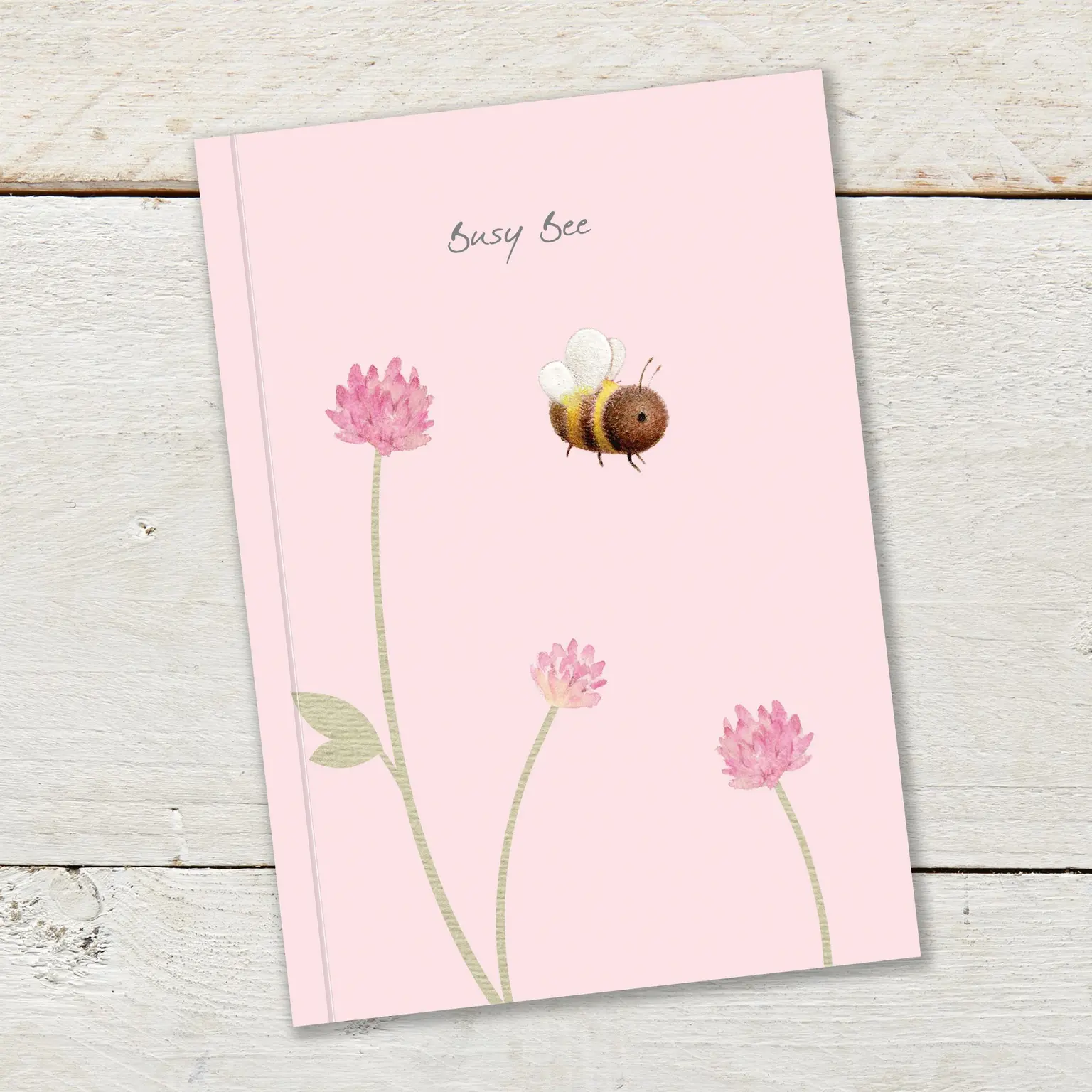 A charming A5 notebook featuring a cute busy bee and pink clover flowers on a pastel pink background colour. Caption on front of notebook reads ‘Busy Bee’.