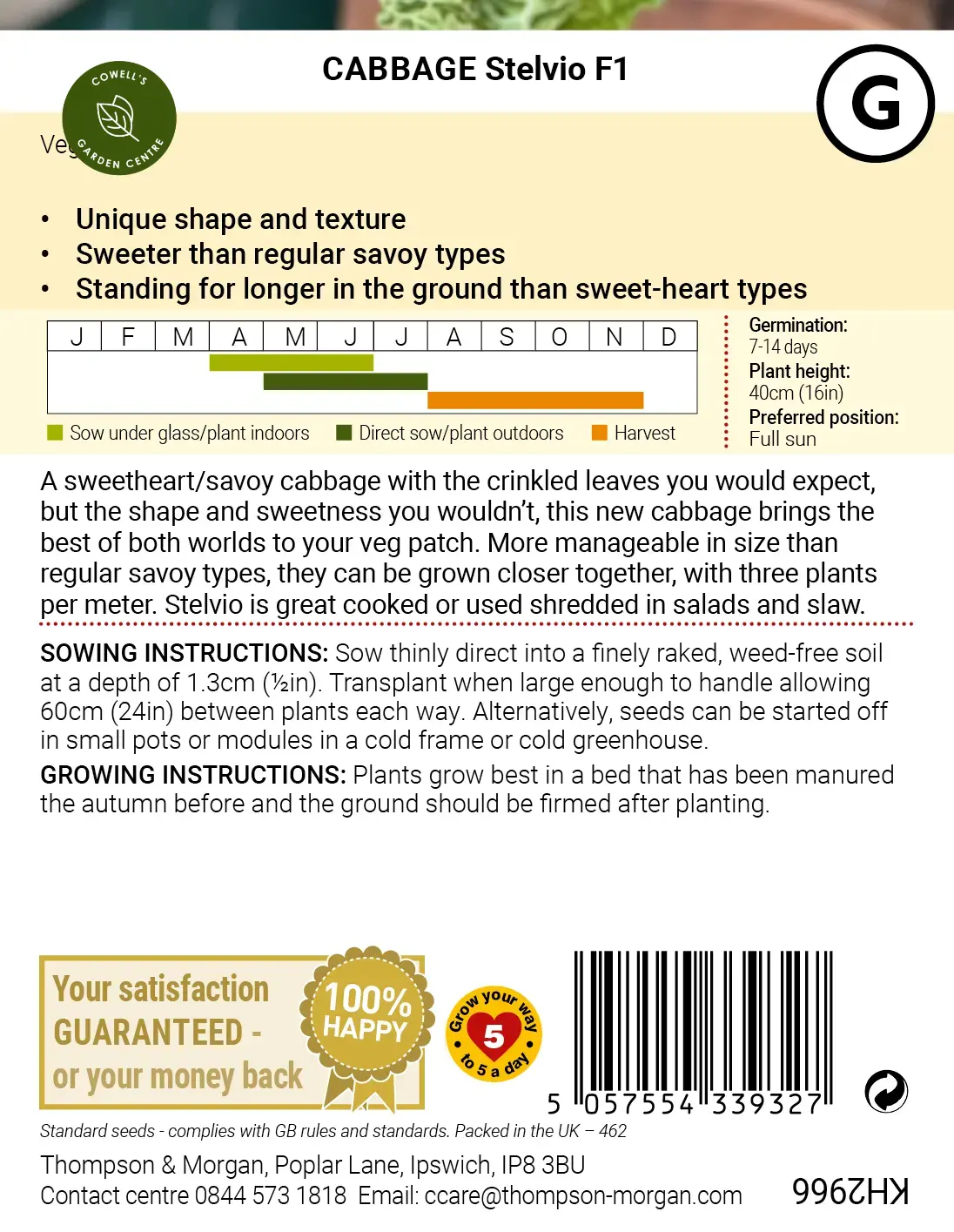 Standing for longer in the ground than sweet-heart types, the heads have a tight leaf structure and are positioned high on the stem improving air flow and making them more resistant to disease. Height and spread: 40cm (16in).