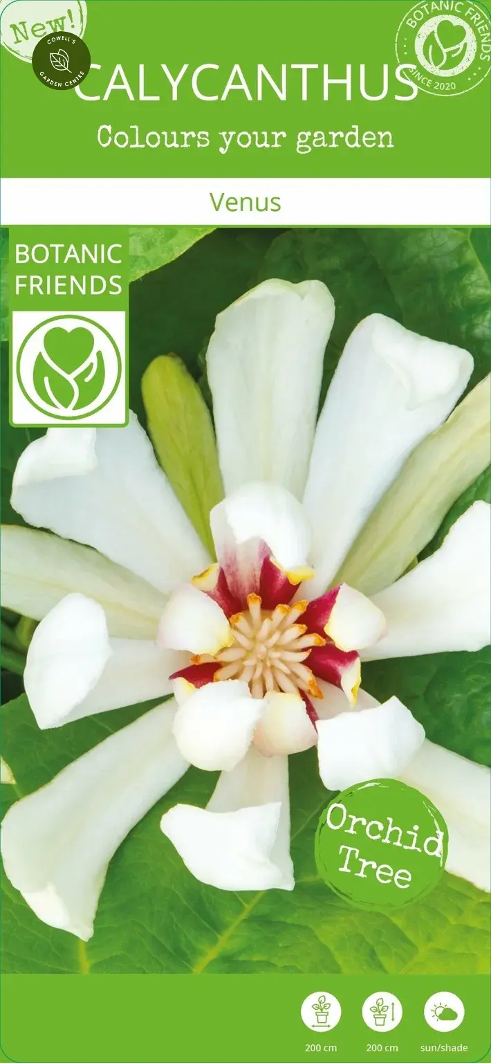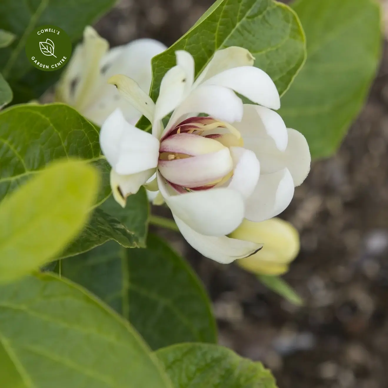 Calycanthus 'Venus' is a beautiful deciduous shrub prized for its exceptionally large, creamy-white flowers that resemble magnolias, each delicately blushed with soft pink. These lightly fragrant blooms appear from late spring into summer, creating a long-lasting floral display that brings elegance and scent to the garden.