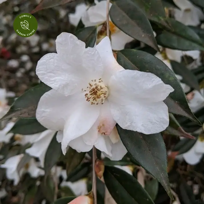 Camellia 'Cornish Snow' is a graceful winter-flowering shrub producing masses of single white blooms reminiscent of wild roses. Buds are often delicately pink-tinged before opening to reveal simple, elegant flowers that brighten the garden from midwinter onwards.