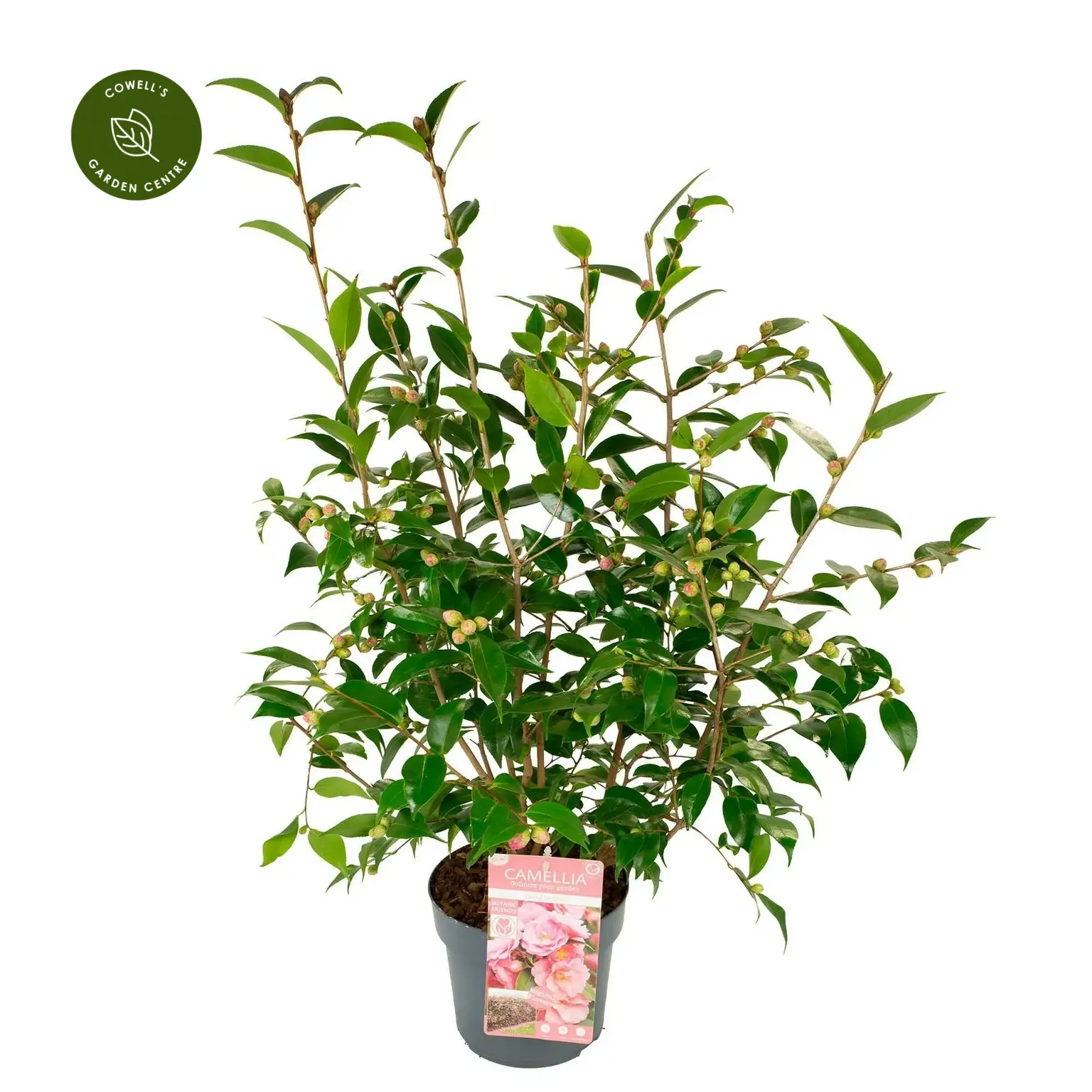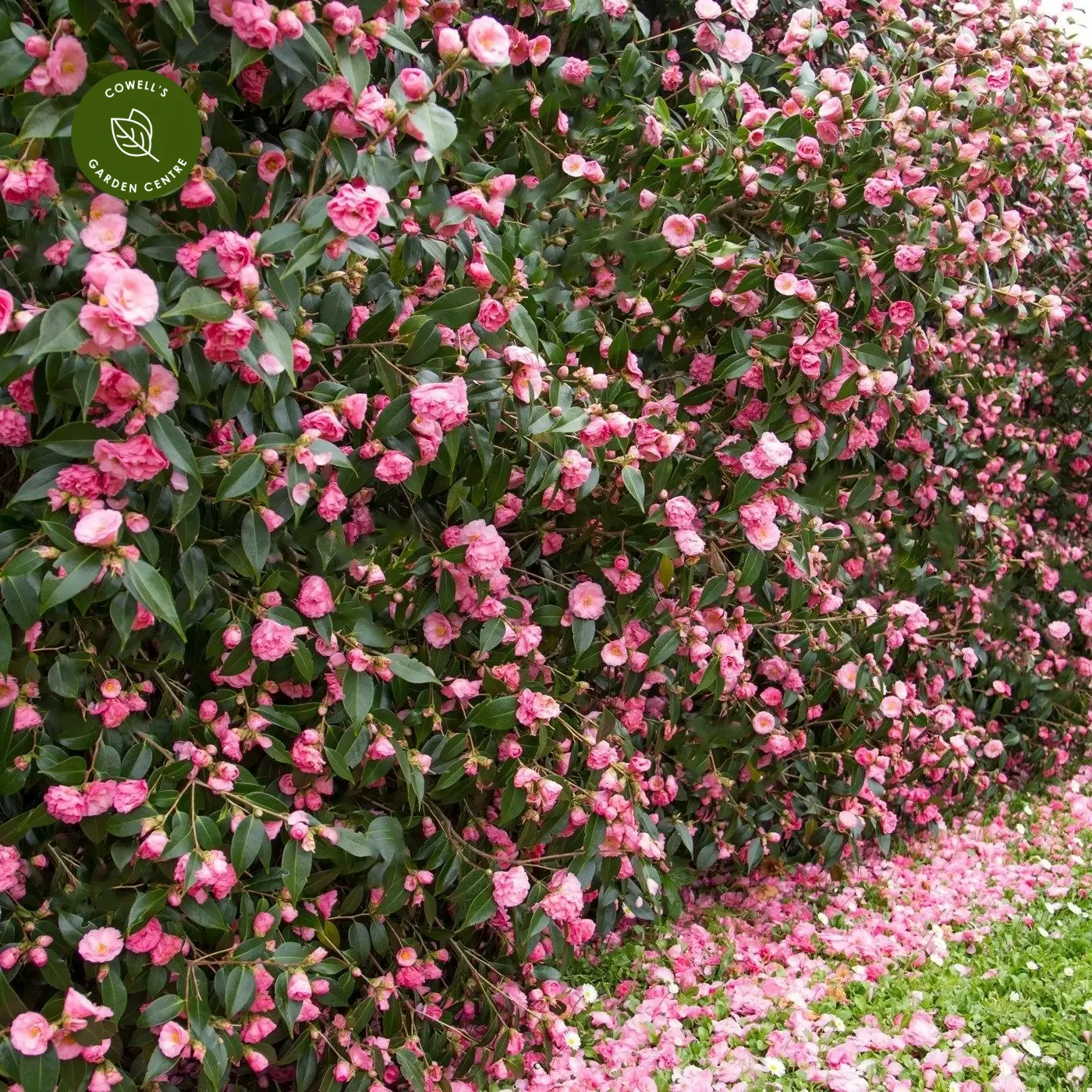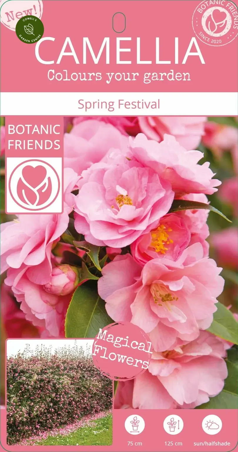 Camellia hybrid 'Spring Festival'® is a charming evergreen shrub that produces a profusion of vibrant pink flowers from February to April, bringing welcome colour to the garden at the end of winter. Its slender, upright habit and fine, glossy green foliage create a graceful display of texture and form throughout the year.
