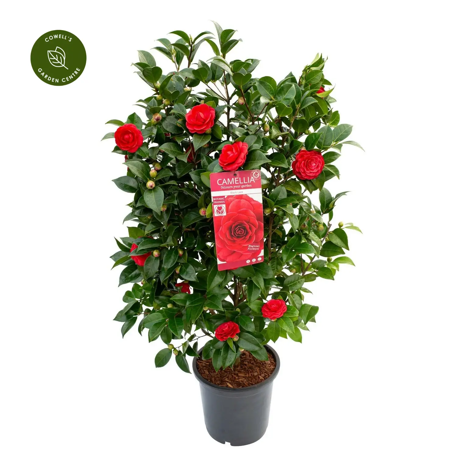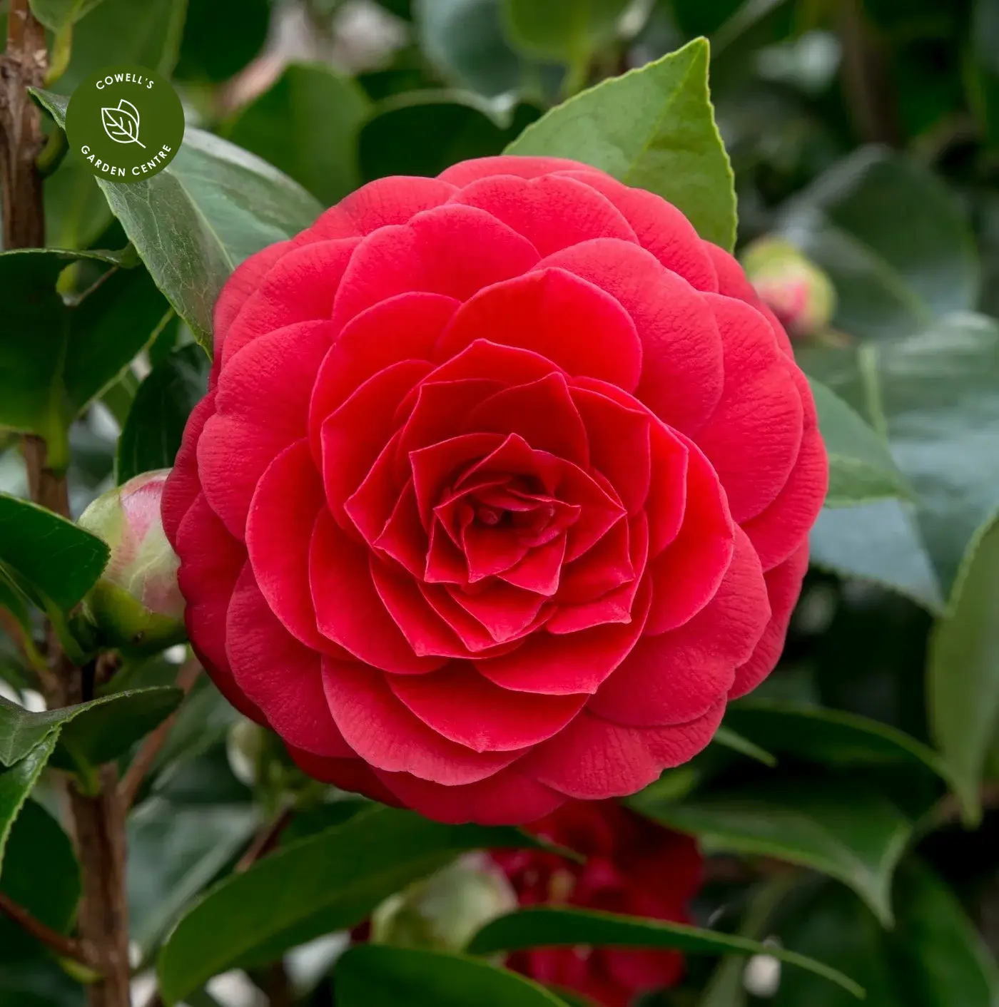 Camellia japonica 'Black Lace' is a dramatic evergreen shrub admired for its striking semi-double blooms in deep, velvety red so dark they appear almost black. Flowering from February to April, the rich blooms provide an elegant contrast against the glossy, dark green foliage, bringing depth and sophistication to shaded borders and woodland gardens.
