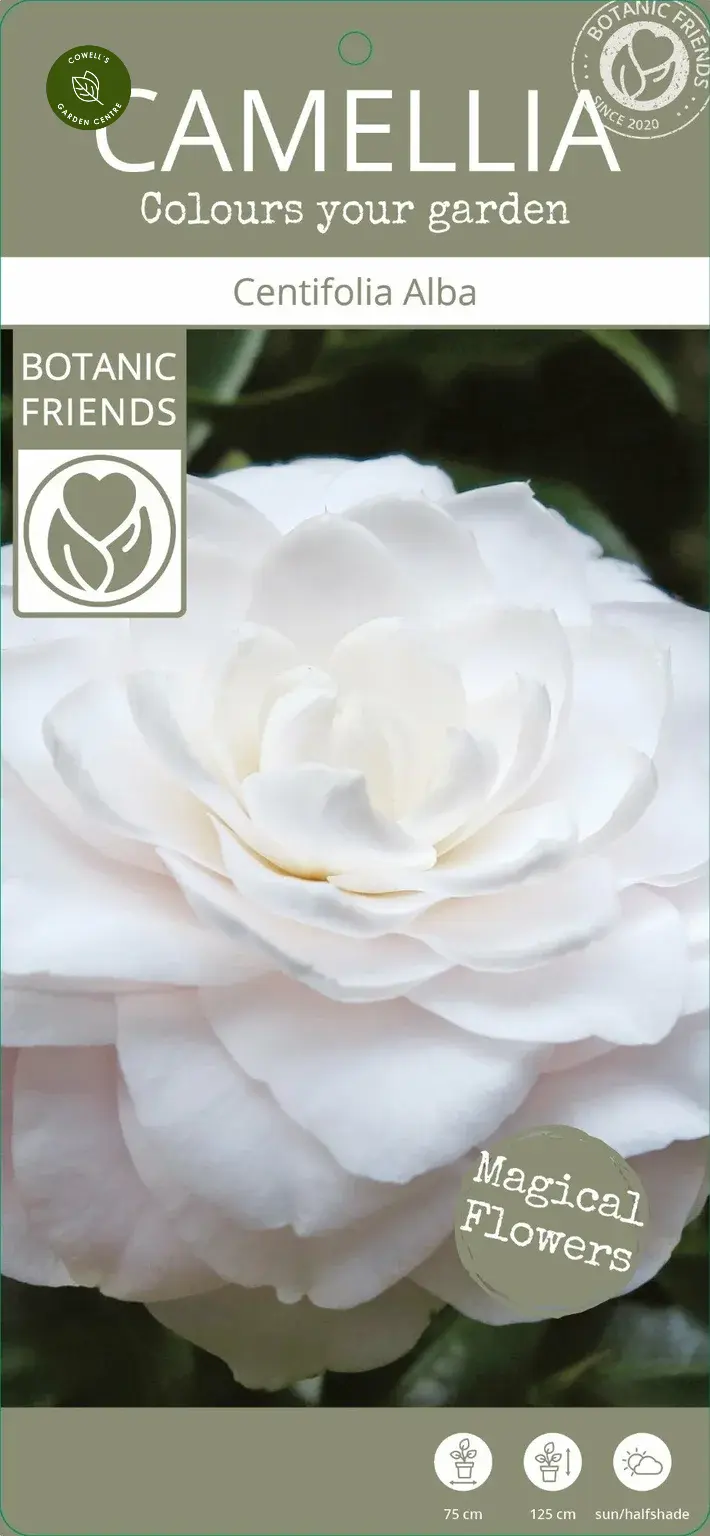 Compact and upright in habit, ‘Centifolia Alba’ is ideal for borders, woodland edges, or statement containers. It thrives in partial shade and moist, acidic, well-drained soil, with shelter from cold winds. The evergreen foliage provides structure throughout the year, while the early blooms attract pollinators on mild spring days, extending the season of garden interest.