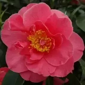 Camellia japonica 'Mrs Swan' is an elegant evergreen shrub producing large, semi-double flowers in a beautiful salmon pink shade, each bloom highlighted by contrasting golden-yellow stamens. Flowering from late winter into spring, it brings welcome colour and structure to the garden at a time when little else is in bloom.