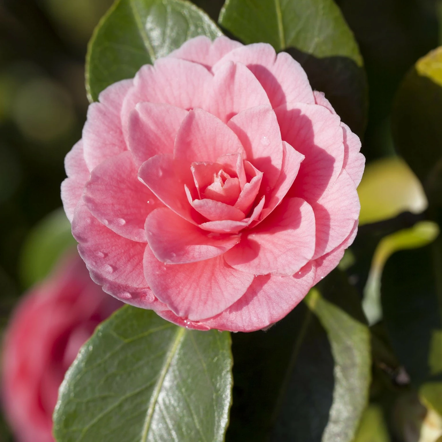 Camellia 'Mrs Tingley' is an elegant evergreen shrub producing an abundance of semi-double, rose-pink flowers from late winter through to spring. Each bloom features delicately layered petals with soft, rounded edges, creating a refined and graceful display against the plant’s glossy, dark green foliage. The long flowering season and classic form make it a timeless choice for shaded gardens.