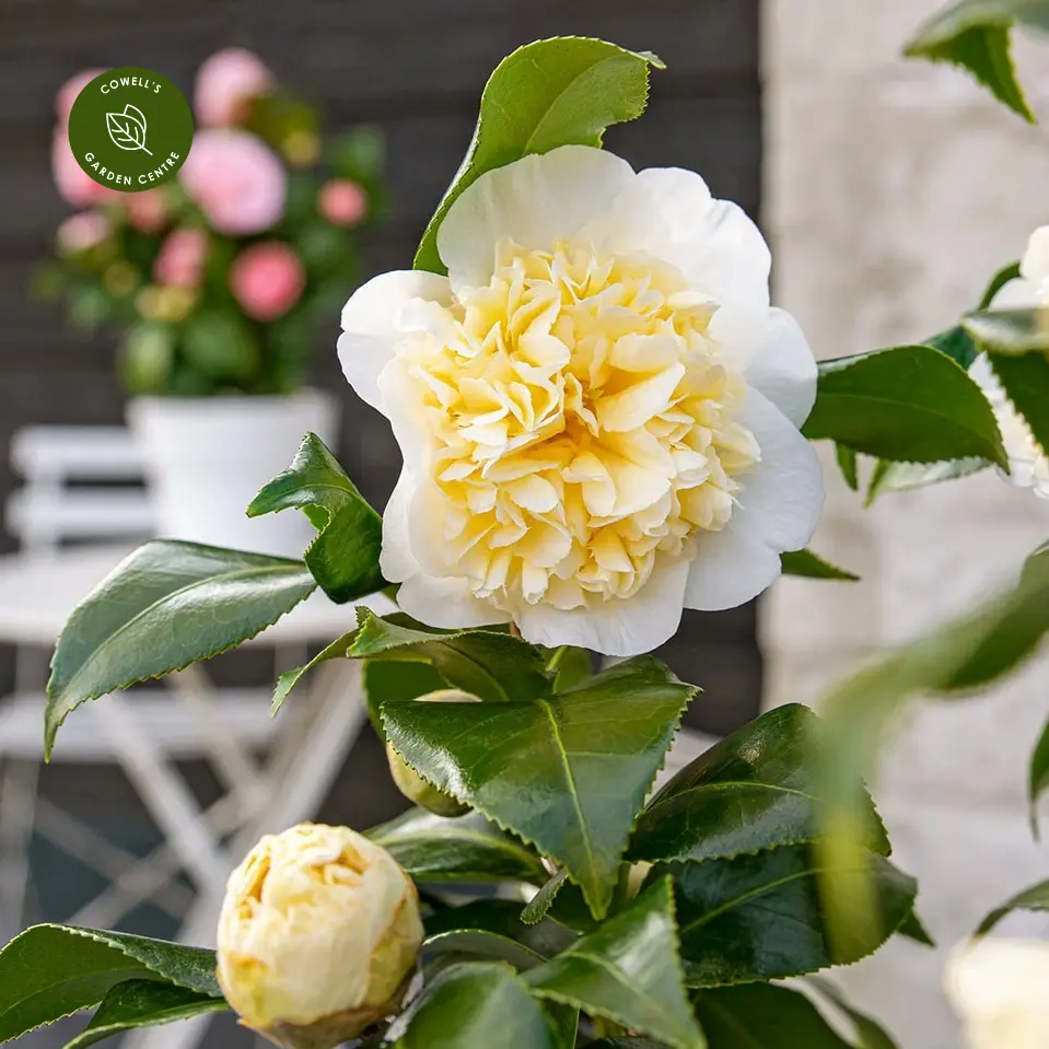 Camellia × williamsii 'Jury's Yellow' is an elegant evergreen shrub with large, creamy-yellow peony-like blooms that appear from February to April. The soft yellow flowers bring a refined touch of luxury to late winter and early spring, glowing beautifully against the glossy, dark green foliage that provides structure throughout the year.