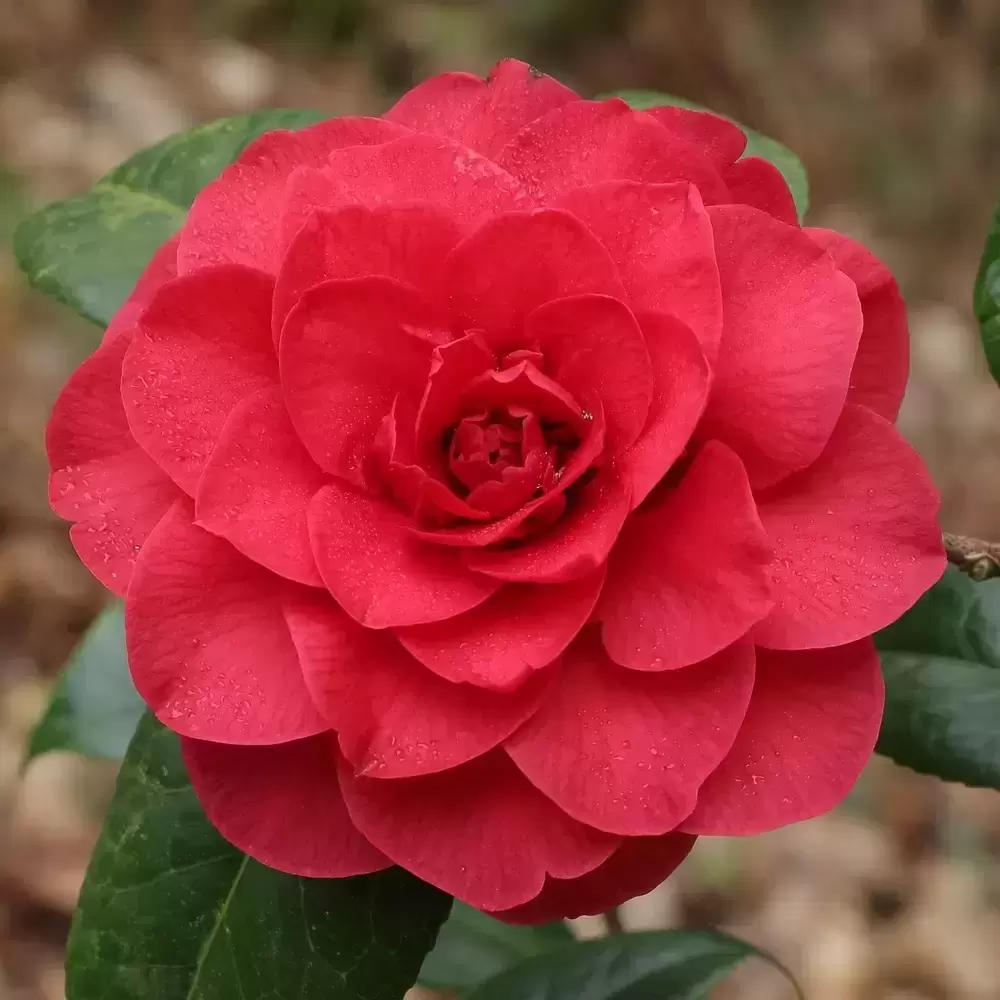 Camellia x williamsii 'Les Jury' is a striking evergreen shrub with glossy, dark green foliage and a compact, bushy habit. From February to April, it produces masses of vibrant red, formal double flowers that create a bold and elegant display at a time when gardens benefit from early colour.