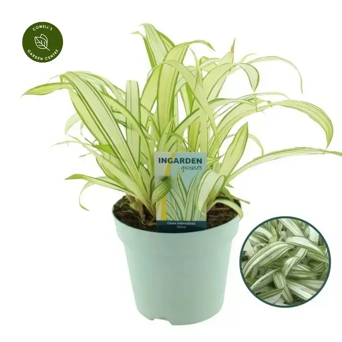 Carex siderosticha 'Shiro' is a striking, low-growing semi-evergreen sedge with broad, arching leaves featuring creamy-white centres and rich green margins. Its bold variegation brings brightness and contrast to shaded areas of the garden.