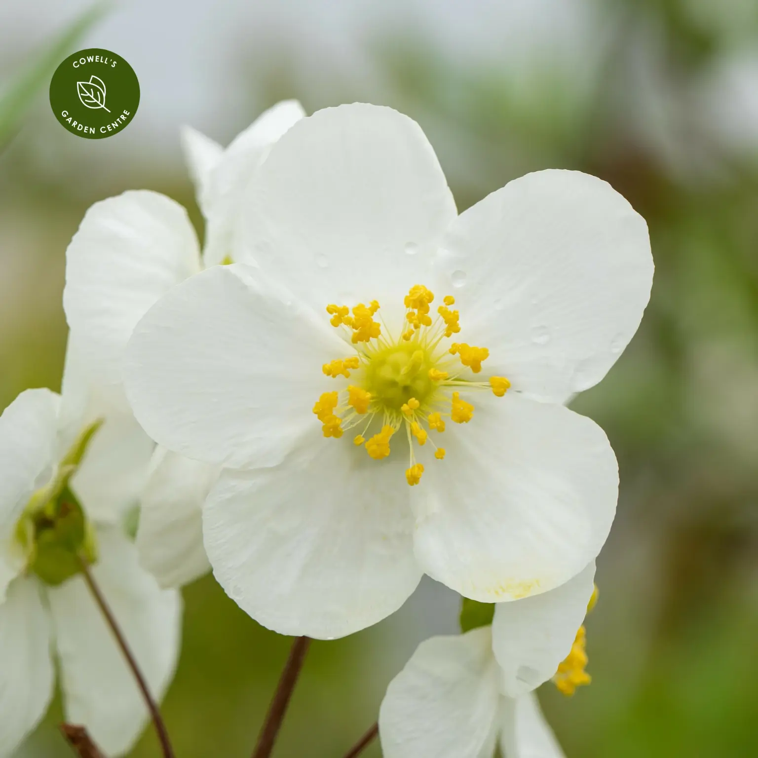 Carpenteria californica is a handsome evergreen shrub valued for its large, pure white flowers and glossy foliage. In early to midsummer it produces fragrant blooms up to 7cm across, each with a cluster of golden stamens that contrast beautifully against the dark green leaves.