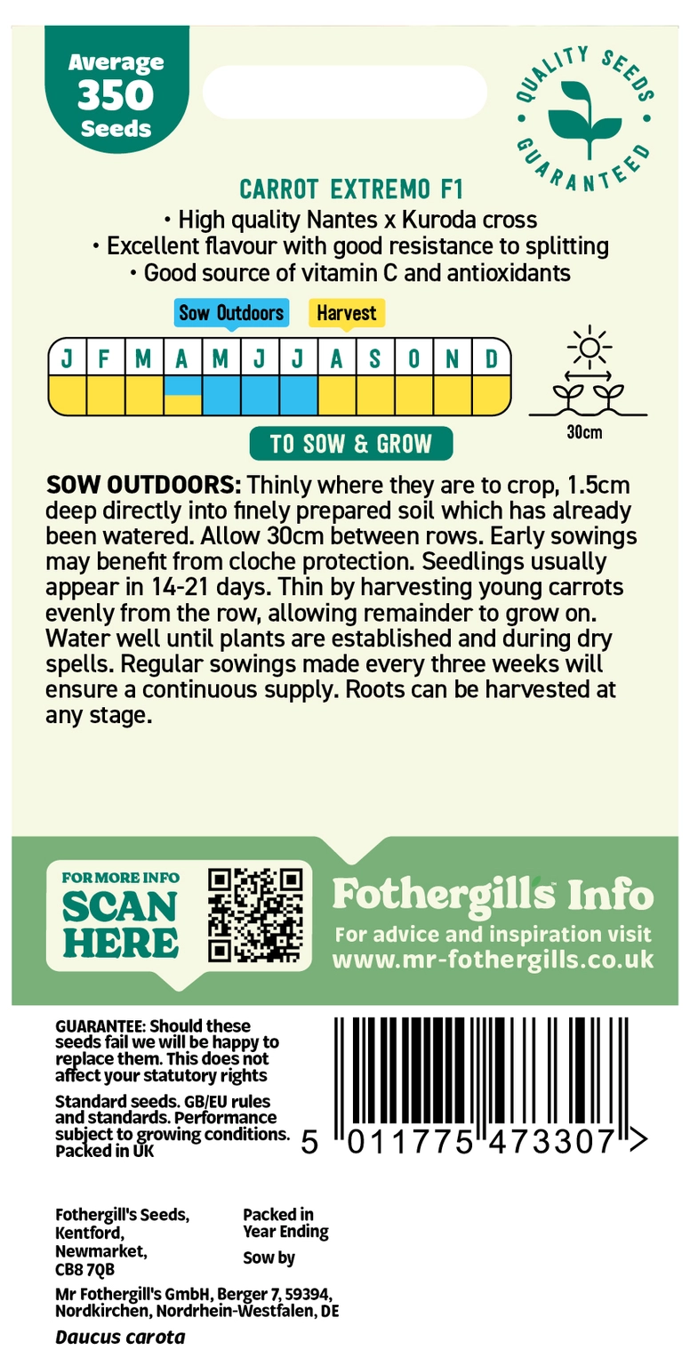 High quality crops through the winter. If carrot fly is a problem, delay sowing until May. Keep well watered during dry spells, as this will prevent the roots from splitting. Remove soil and store in dry sand.