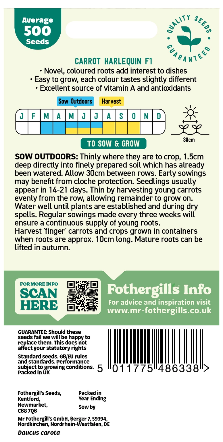 A real talking point, fun and easy to grow. If carrot fly is a problem, delay sowing until May. Keep well watered during dry spells, as this will prevent the roots from splitting. Remove soil and store in dry sand.