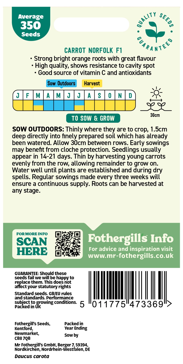 Easy to grow for harvests all winter. If carrot fly is a problem, delay sowing until May. Keep well watered during dry spells, as this will prevent the roots from splitting. Remove soil and store in dry sand.