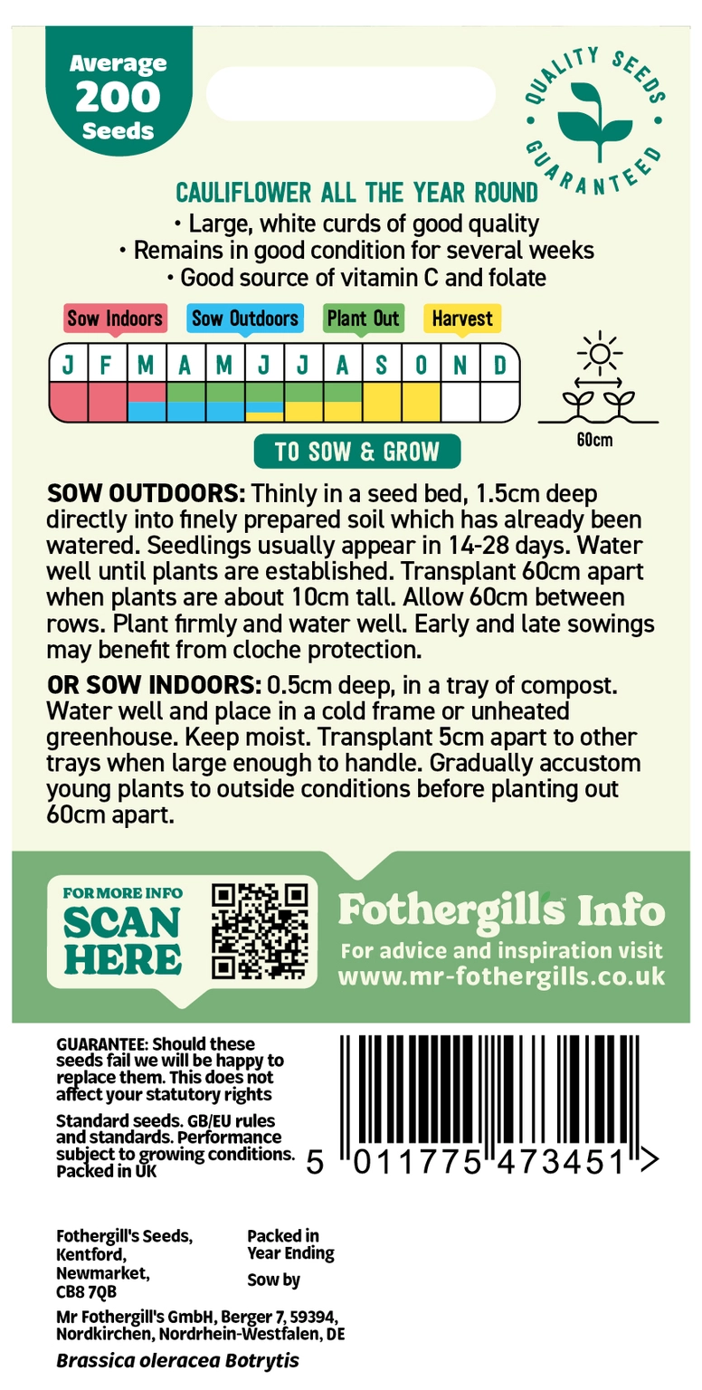 Versatile, reliable and tasty. Snap and turn the outer leaves over the heads to protect against frost and sunlight to preserve curd quality.