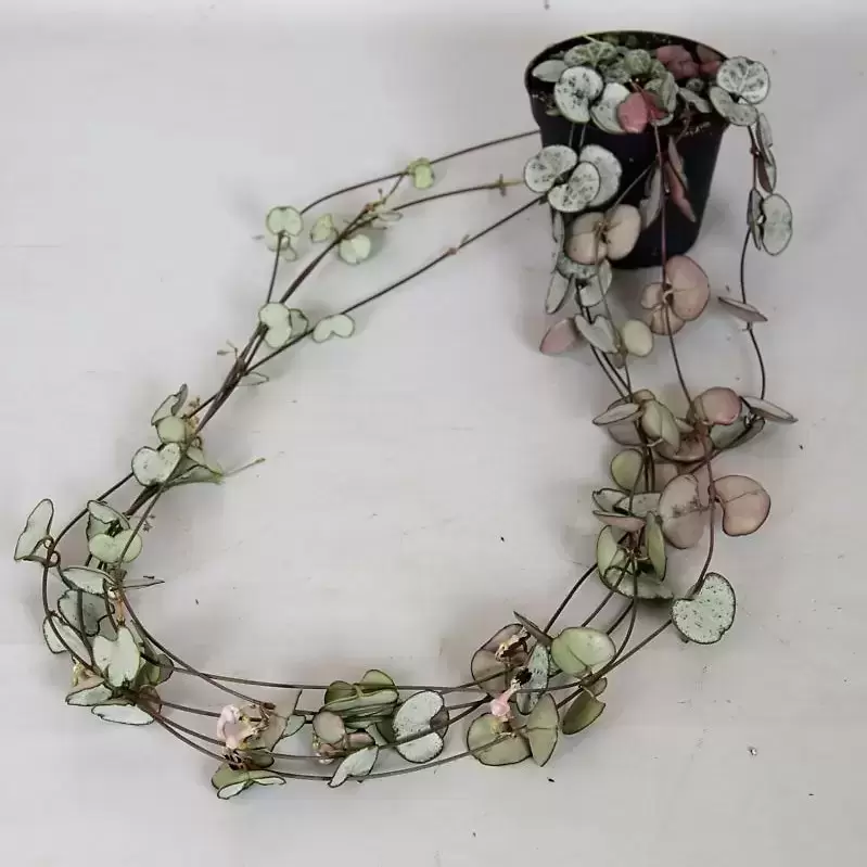 Delicate, trailing houseplant with slender vines and silver leaves with darker green edges.