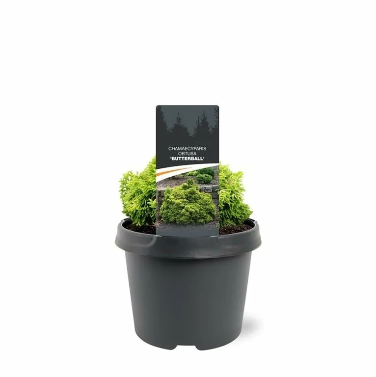 Chamaecyparis obtusa 'Butterball' is a compact, slow-growing evergreen conifer valued for its bright golden-yellow foliage and neat, rounded habit. Its dense sprays of soft, feathery foliage form a tidy mound that holds its colour year-round, adding a splash of brightness to borders, rockeries, and containers.