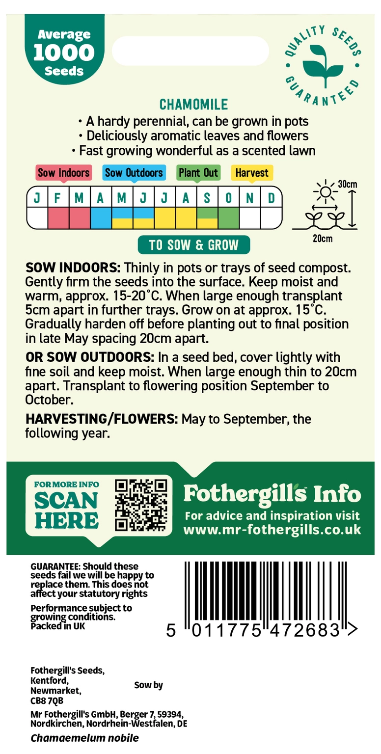 Aromatic, for teas and classic lawns. Cut back plants regularly to obtain dense growth needed for a lush Chamomile lawn.
