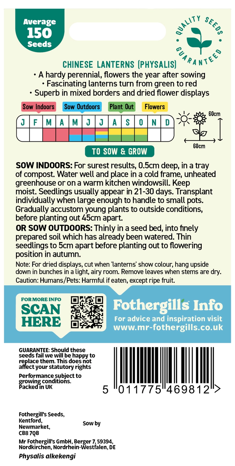 Fascinating red ‘lanterns’ in autumn. For dried displays, cut when ‘lanterns’ show colour, hang upside down in bunches in a light, airy room. Remove leaves when stems are dry.