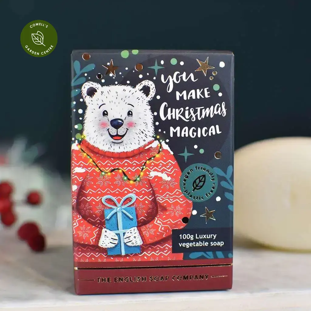 Indulge in festive self-care with this Christmas Polar Bear Mini Soap. Expertly crafted from pure vegetable oils and enriched with shea butter, this vegan-friendly soap creates a creamy, nourishing lather that leaves skin soft and beautifully scented. Generously fragranced and presented in fully recyclable, plastic-free packaging decorated with charming illustrations, it makes the perfect eco-conscious gift or a little luxury for yourself.
