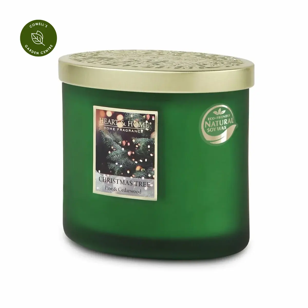 Christmas Tree brings the scent of Evergreen fir trees, cedarwood and a touch of honey, with natural twin cotton wicks for a clean burn.
