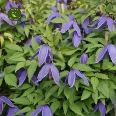 - Early-flowering clematis with nodding blue bell-shaped flowers