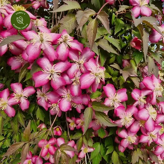 Clematis montana 'Rose Truffle' is a striking variety selected for its dark bronze-green foliage and abundance of rosy pink flowers. Blooming in April and May, its large, open blooms contrast beautifully with the rich-toned leaves, creating a dramatic and elegant display in spring.